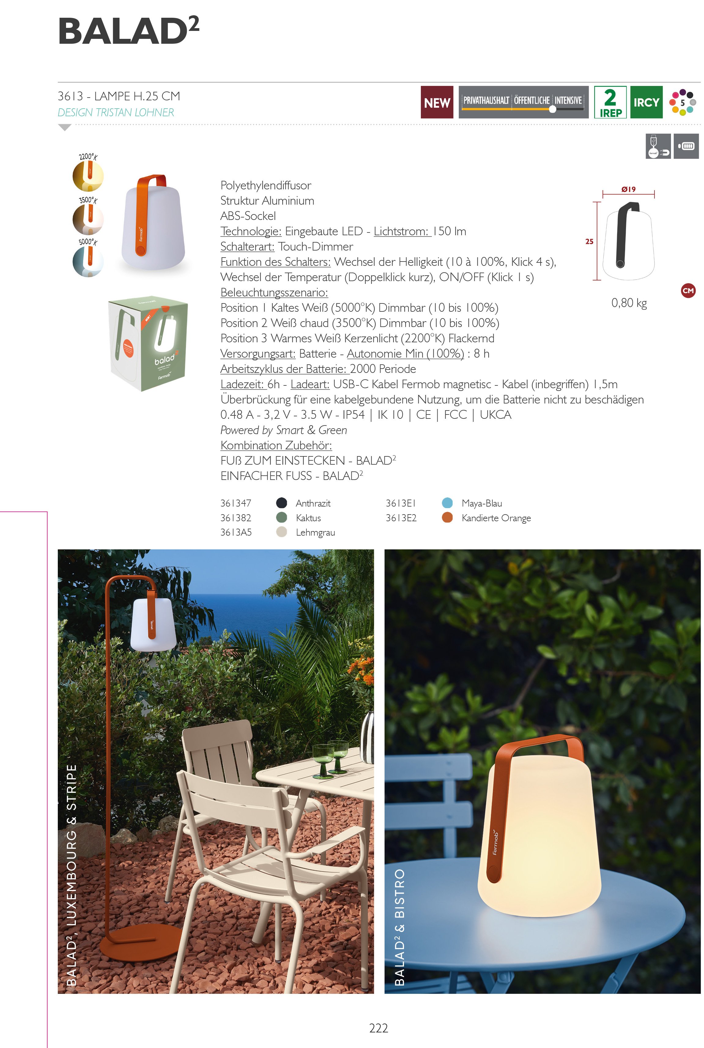 Designed by Tristan Lohner, the Balad² rechargeable lamp from Fermob is an iconic design object that combines flexibility and aesthetics as a mobile light source on balconies, terraces or in living rooms. Made from weatherproof aluminium and polyethylene, the lamp is fully suitable for outdoor use and can easily be taken anywhere with its characteristic carrying handle. The special features of this further development are the different light modes and colour temperatures, which can be varied from warm candlelight to bright light at the touch of a button.