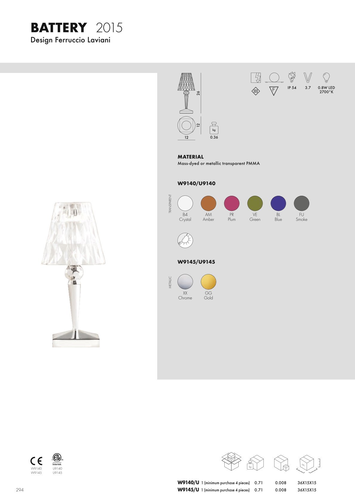 | Certificates | Degree of protection IP 54, insulation class III Since 1996 Kartell has certified its Quality Management System according to UNI EN ISO 9001 and 2012. In addition, Kartell posses the demanding certification UNI EN ISO 14001, which guarantees effective environmental management systems. |