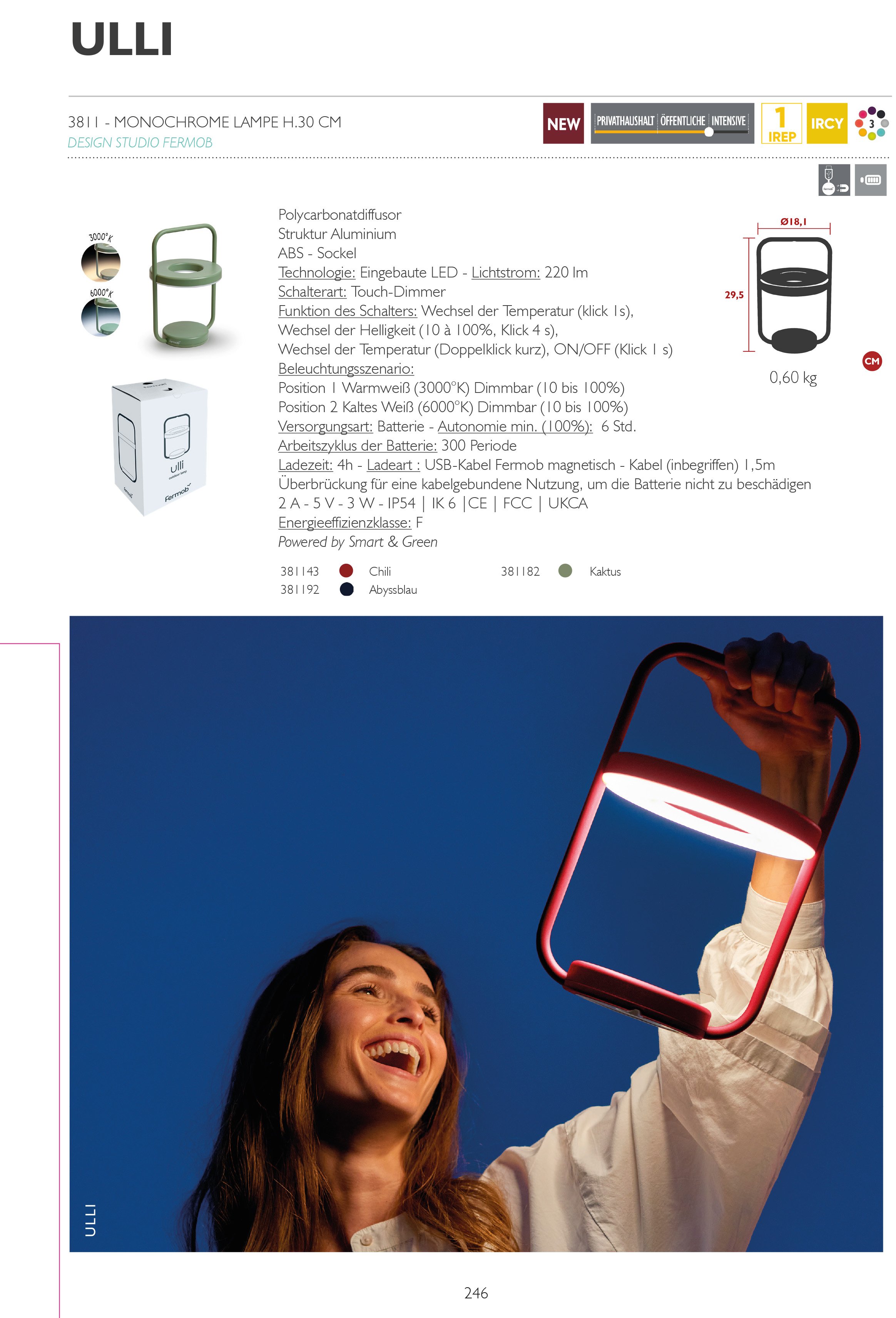 The portable Ulli rechargeable lamp Monochrome from Fermob is a versatile lighting companion that creates atmospheric accents both in modern interiors and in sheltered outdoor areas. Its striking, minimalist design made of robust aluminium is specially designed for mobile use and can withstand the demands of outdoor use thanks to its high-quality workmanship. The model is characterised by its monochrome aesthetics and intuitive dimming function, which allows the light intensity to be individually adjusted to any situation. With its impressive battery life and practical USB charging system, this light combines functional independence with timeless French style.