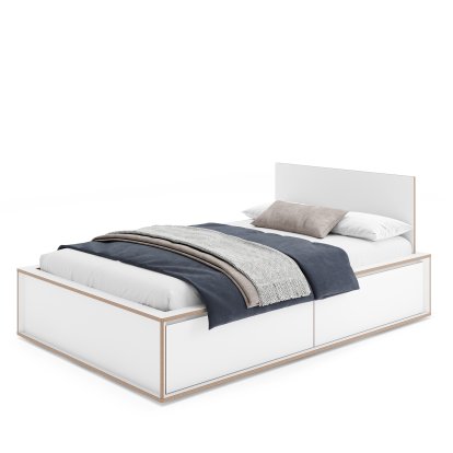 The material wood is the first choice in bed design. On the one hand, its naturalness creates the perfect atmosphere for a restful sleep, on the other wood, especially in the form of plywood, can be perfectly processed into stable constructions. Bed designs made from high-quality multiplex panels are very much in vogue: First-class, simple designs in subtle colours can be found, for example, in the portfolios of manufacturers such as Nils Holger Moormann or Müller Small Living. The Moormann Siebenschläfer bed, e.g., is made of birch plywood and impresses with its simple construction, clear edges and a thoroughly timeless design language.