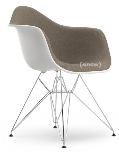 Eames Plastic Armchair RE DAR, White non-RE, With full upholstery, Warm grey / moor brown, Standard version - 43 cm, Chrome-plated