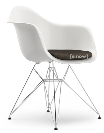 Eames Plastic Armchair RE DAR, White non-RE, With seat upholstery, Warm grey / moor brown, Standard version - 43 cm, Chrome-plated