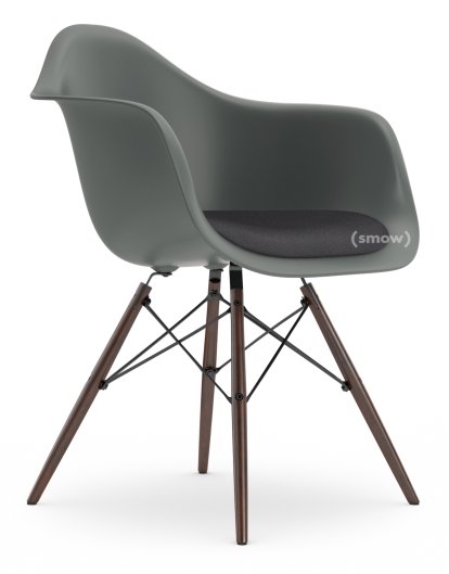 Eames Plastic Armchair RE DAW, Granite grey, With seat upholstery, Dark grey, Standard version - 43 cm, Dark maple