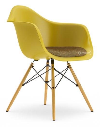 Eames Plastic Armchair RE DAW, Mustard, With seat upholstery, Mustard / dark grey, Standard version - 43 cm, Yellowish maple