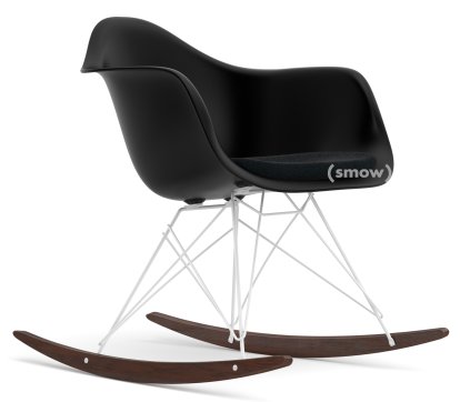 The compact rocking chair RAR with upholstery by Vitra is similar to the classic Eames RAR rocking chair, but comes either with seat upholstery or fully upholstered, and thus has minimally adapted dimensions, adapted dimensions necessitated by the statics of the iconic rocking chair. The Eames RAR chair, short for Rocking Armchair Rod Base, belongs to the legendary family of the original Eames Chairs by Vitra and achieves a new comfort thanks to its upholstery. The RAR by Charles & Ray Eames is a chair full of accents: an organic plastic seat shell meets pleasant fabric, while the metal base is contrasted with rockers in warm wood tones. And thus the RAR with seat upholstery is a rocking chair full of contrasts, yet contrasts which combine to make the design classic a harmonious, elegant piece of living room furniture. Since 2024 Vitra has manufactured the Eames Plastic Chair seat shells from resource-saving recycled material.