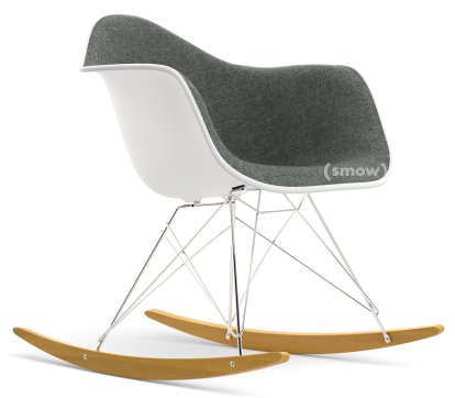 The compact rocking chair RAR with upholstery by Vitra is similar to the classic Eames RAR rocking chair, but comes either with seat upholstery or fully upholstered, and thus has minimally adapted dimensions, adapted dimensions necessitated by the statics of the iconic rocking chair. The Eames RAR chair, short for Rocking Armchair Rod Base, belongs to the legendary family of the original Eames Chairs by Vitra and achieves a new comfort thanks to its upholstery. The RAR by Charles & Ray Eames is a chair full of accents: an organic plastic seat shell meets pleasant fabric, while the metal base is contrasted with rockers in warm wood tones. And thus the RAR with seat upholstery is a rocking chair full of contrasts, yet contrasts which combine to make the design classic a harmonious, elegant piece of living room furniture. Since 2024 Vitra has manufactured the Eames Plastic Chair seat shells from resource-saving recycled material.