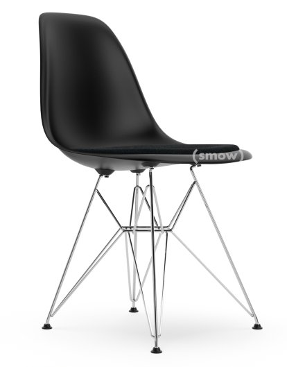 Eames Plastic Side Chair RE DSR, Deep black, With seat upholstery, Nero, Standard version - 43 cm, Chrome-plated