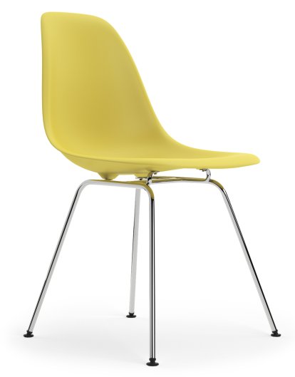 In 1948 the Museum of Modern Art in New York initiated the "Low Cost Furniture Design" contest; a search for innovative designs which met the demands of the modern American lifestyle through functionality, affordability and flexibility. With his plastic side chairs family Charles Eames was among the winners. After much experimentation with different materials he had developed a one-piece bucket seat made of fibreglass reinforced polyester resin. This combination of shape and material allowed the Eames side chairs and Eames armchairs to be produced in series. The Eames plastic chairs seat shells can be combined with different bases to create chairs suitable for all occasions and situations. The abbreviation of the Eames DSX stands for Dining Height Side Chair with X-Base; i.e. the slim shape of the side chair seat shell is combined with a simple four-legged steel tube base.
