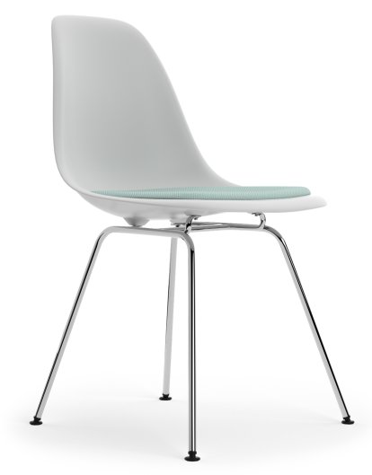 In 1948 the Museum of Modern Art in New York initiated the "Low Cost Furniture Design" contest; a search for innovative designs which met the demands of the modern American lifestyle through functionality, affordability and flexibility. With his plastic side chairs family Charles Eames was among the winners. After much experimentation with different materials he had developed a one-piece bucket seat made of fibreglass reinforced polyester resin. This combination of shape and material allowed the Eames side chairs and Eames armchairs to be produced in series. The Eames plastic chairs seat shells can be combined with different bases to create chairs suitable for all occasions and situations. The abbreviation of the Eames DSX stands for Dining Height Side Chair with X-Base; i.e. the slim shape of the side chair seat shell is combined with a simple four-legged steel tube base.