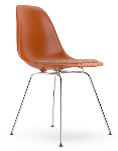 Eames Plastic Side Chair RE DSX, Rusty orange, With seat upholstery, Cognac / ivory, Standard version - 43 cm, Chrome-plated