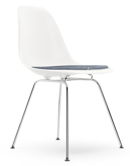 Eames Plastic Side Chair RE DSX, White non-RE, With seat upholstery, Dark blue / ivory, Standard version - 43 cm, Chrome-plated