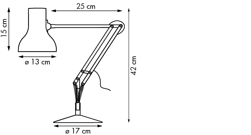 | Dimensions | ![]() Maximum extension: 50 cm (from base to shade) Cable length: 180 cm |