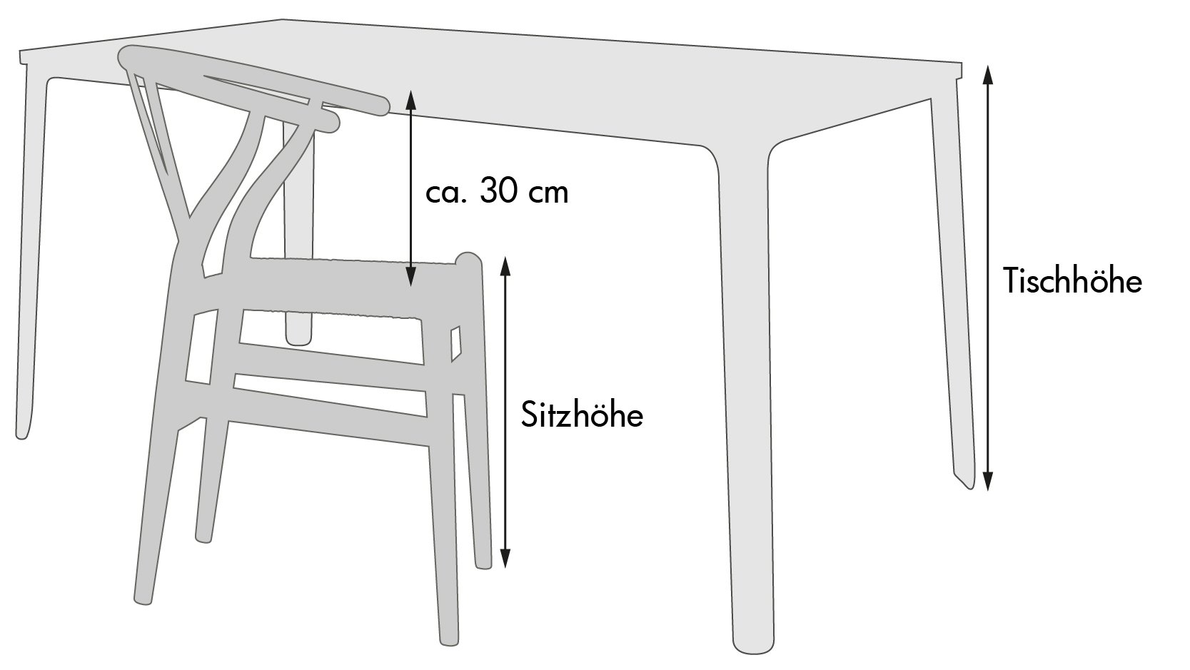 The height of your dining table is as with the design a matter of individual preference, but should ideally be between 72 and 80 cm. The minimum distance between the seat of the chair and the edge of the table should be 30 cm. Do you already have chairs and are looking for a suitable dining table? Then don't forget to measure the seat height of your chairs beforehand. If chairs with armrests are used, ensure that there is sufficient space between the armrests and the edge of the table.
