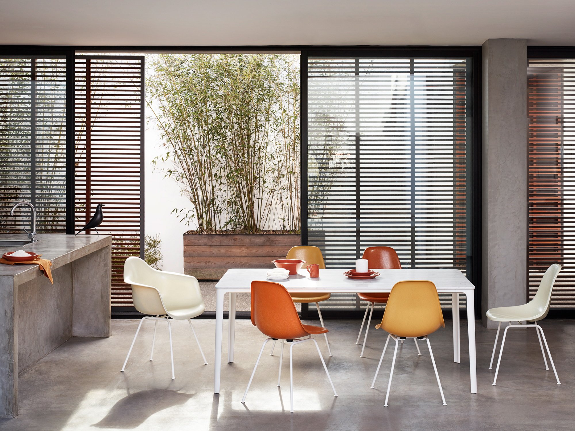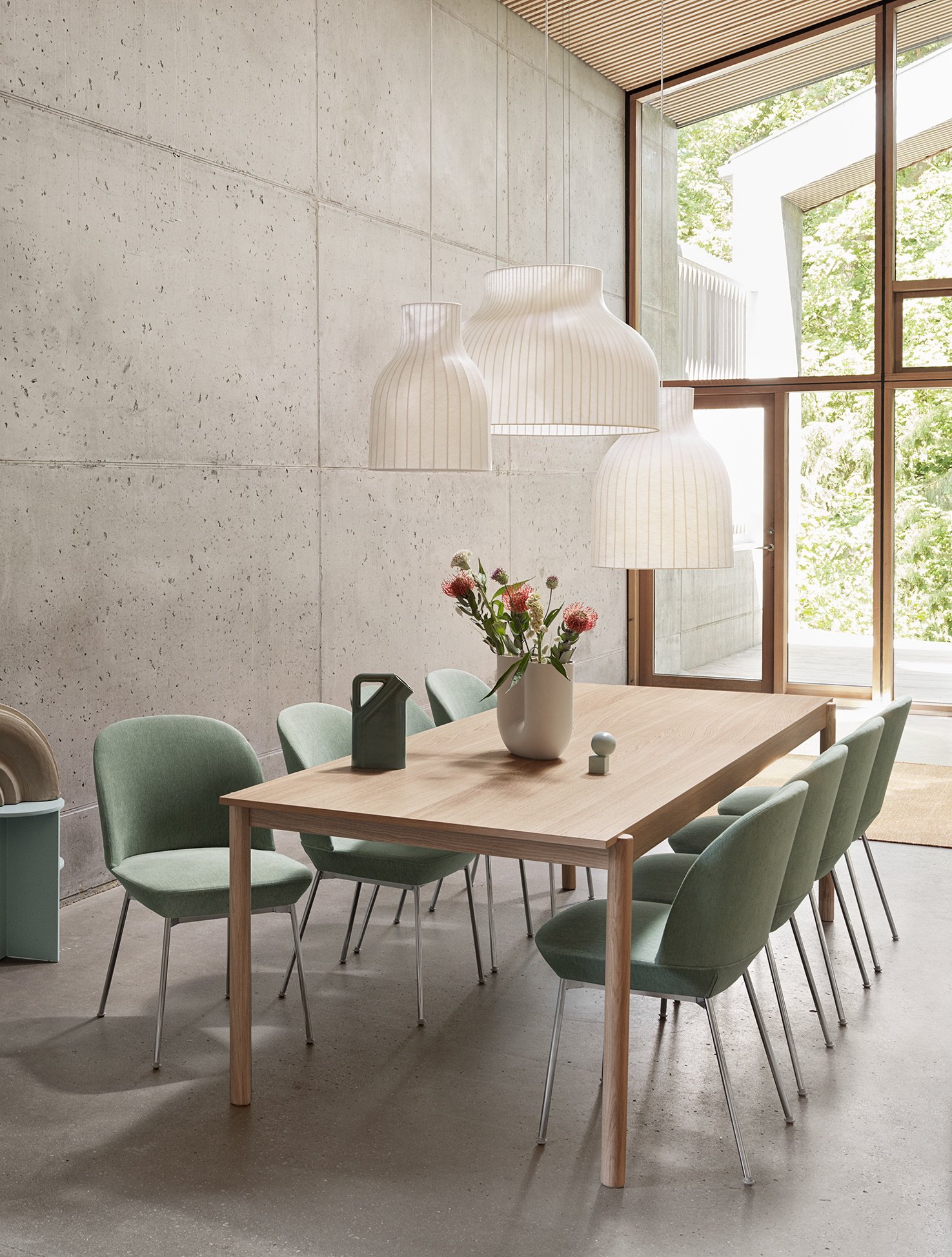 The arrangement of the chairs depends on the type of table base. If you have decided on a table with the table legs placed directly on the corners, then the chairs can be arranged along the entire length of the table and the front sides. Legs that are indented or placed further under the table top offer more space for those sitting on the ends, but on the long sides the chairs must be arranged around the table legs. If the base is placed in the middle, your dining room chairs can be arranged as you wish. Of course, the width of your chairs plays a major role here. It is recommended to measure space, table and chairs carefully beforehand to ensure you find the perfect chair-table combination.