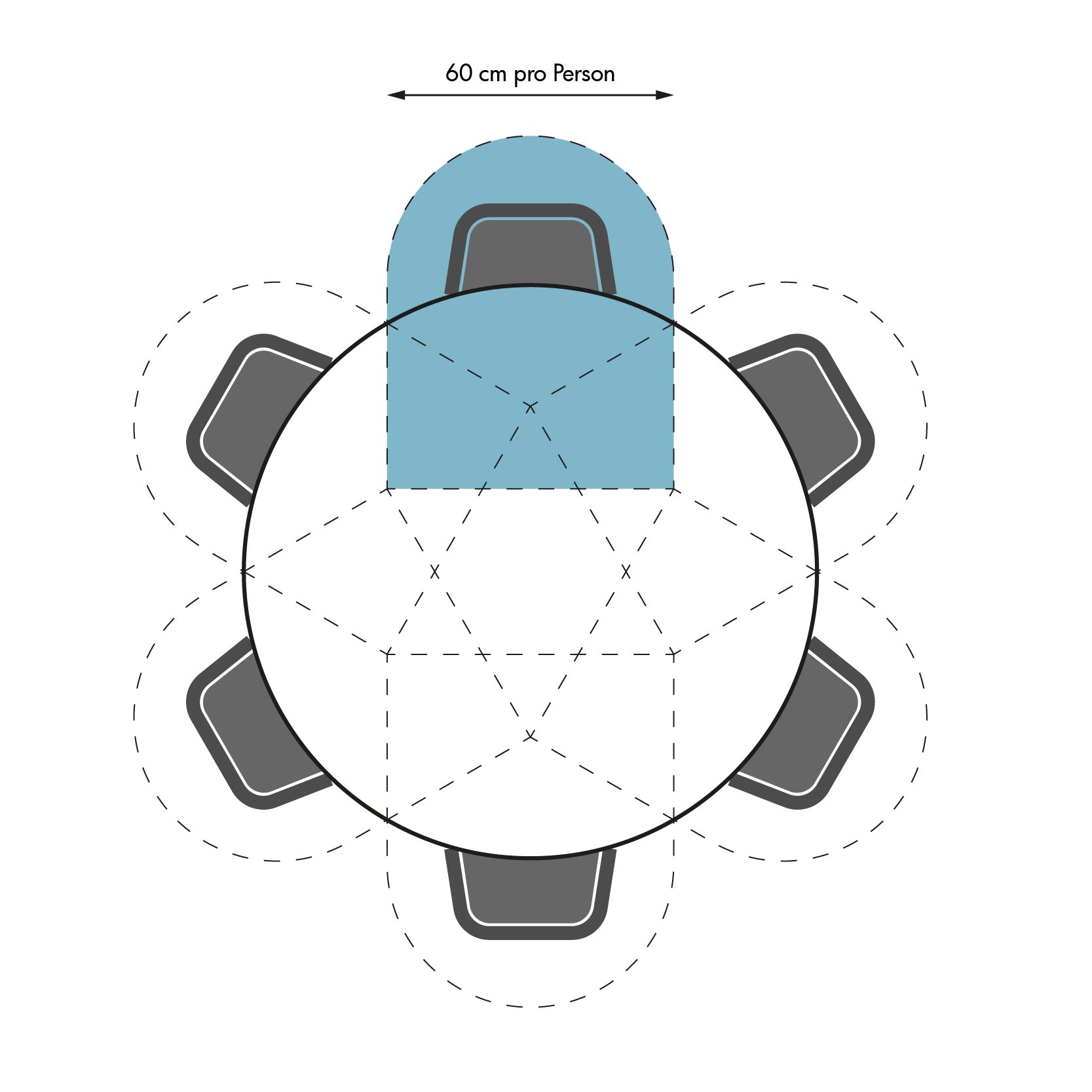To find out how many people can fit around a round dining table, there is a simple solution: mathematics! Take the diameter, for example 100 cm, multiply this value by pi and divide the result by 60 (60 cm being the necessary width per person). In this case you will get a result just over 5, which means that there is room for 5 people at your table.