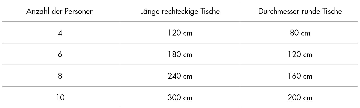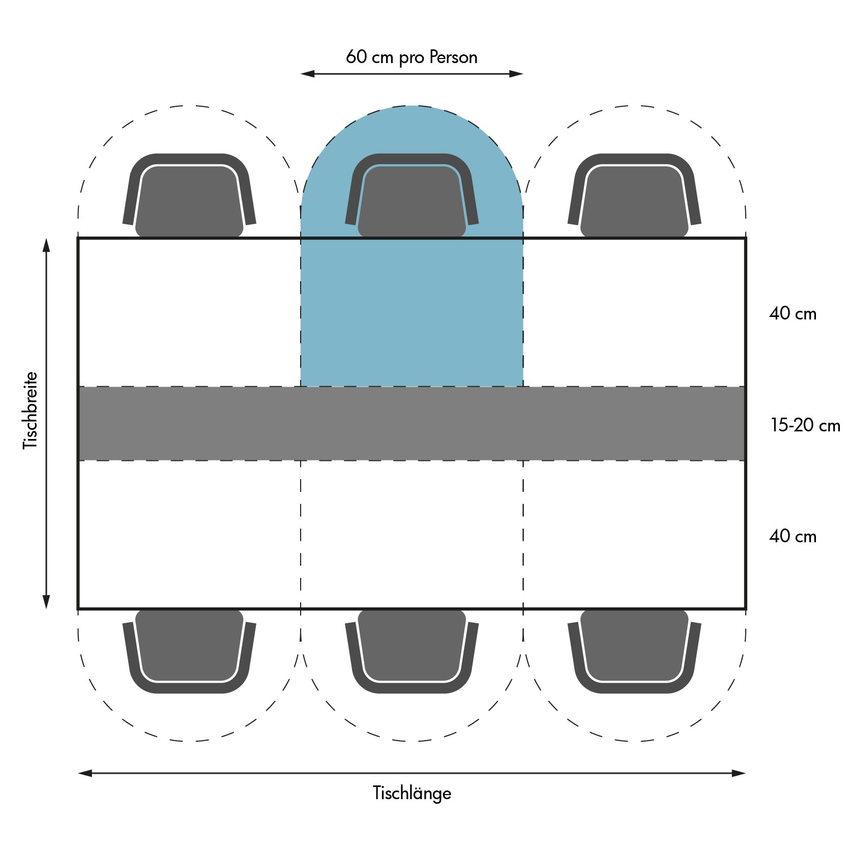 The overall width of your dining table, including the chairs, is the decisive factor. You should add 50 cm to the table width per chair and allow for at least 30 cm of passage so that you can get up and leave the table without disturbing the other people sitting.