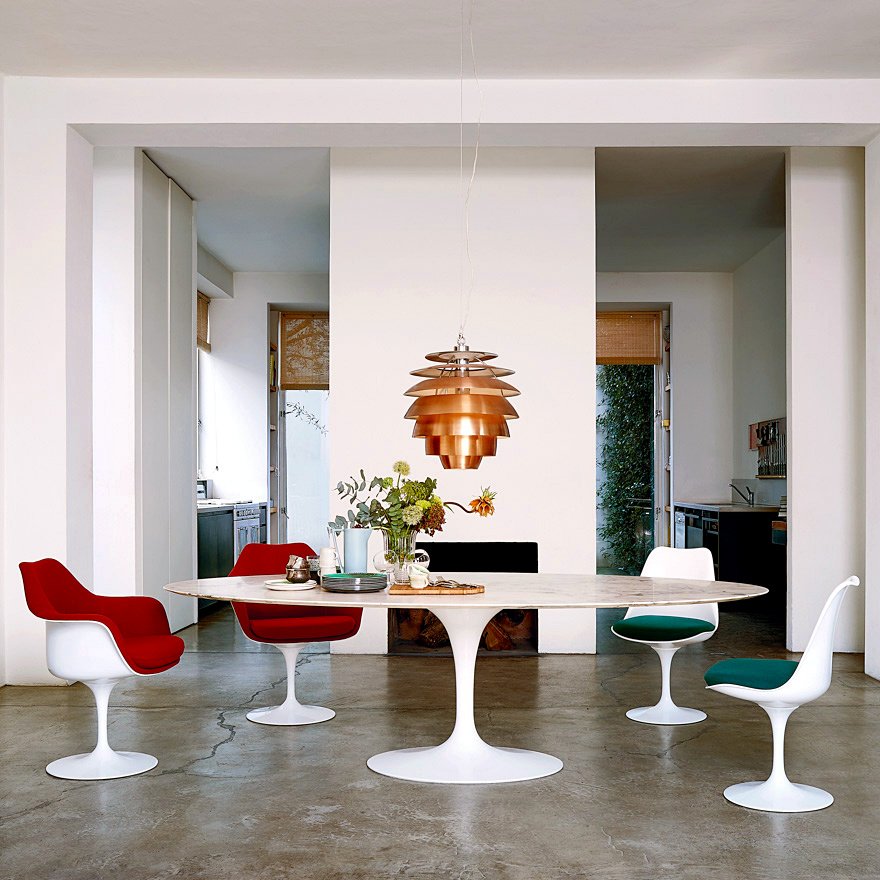 Panton Chair by Verner Panton: The curved shape of the Panton Chair fits surprisingly well into the organic aesthetics of the Saarinen dining tables and at the same time sets a futuristic accent.