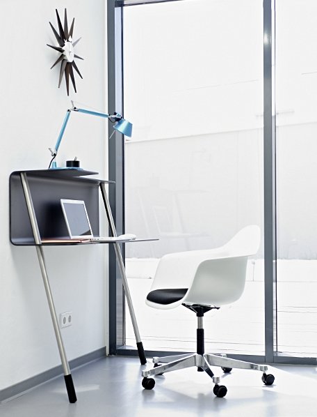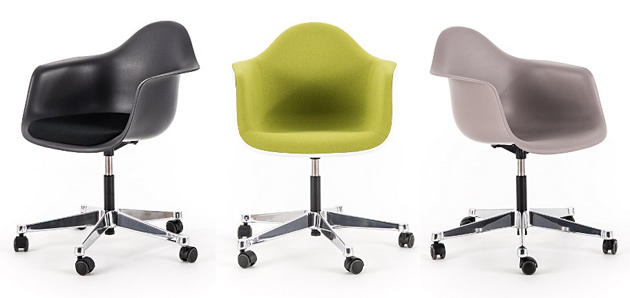 The Eames plastic chairs, including the Eames PACC, belong to those few objects in the history of furniture design that have not only enjoyed a great popularity but effortlessly transform design classics into everyday lifestyle objects. The basic idea for the Eames chair family grew out of a design competition organized in 1950 by the Museum of Modern Art, New York, the "International Competition for Low cost Furniture". For their series of moulded fibreglass chairs Ray and Charles Eames were awarded second place. The series consists of Eames armchairs and Eames side chairs, with a range of bases and available in numerous colours. The Vitra PACC combines an Eames A Shell with a chrome plated five-foot base with casters and is with the accompanying PSCC the work horses of the Eames chairs.
