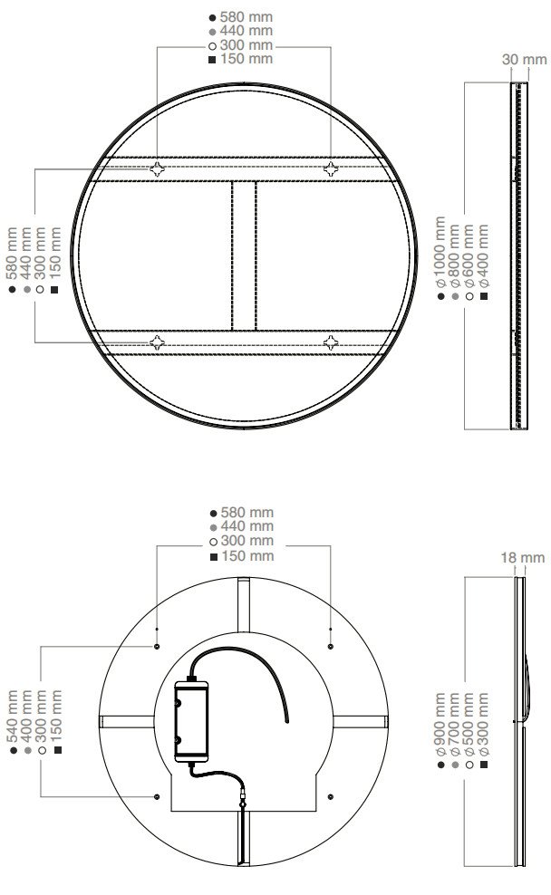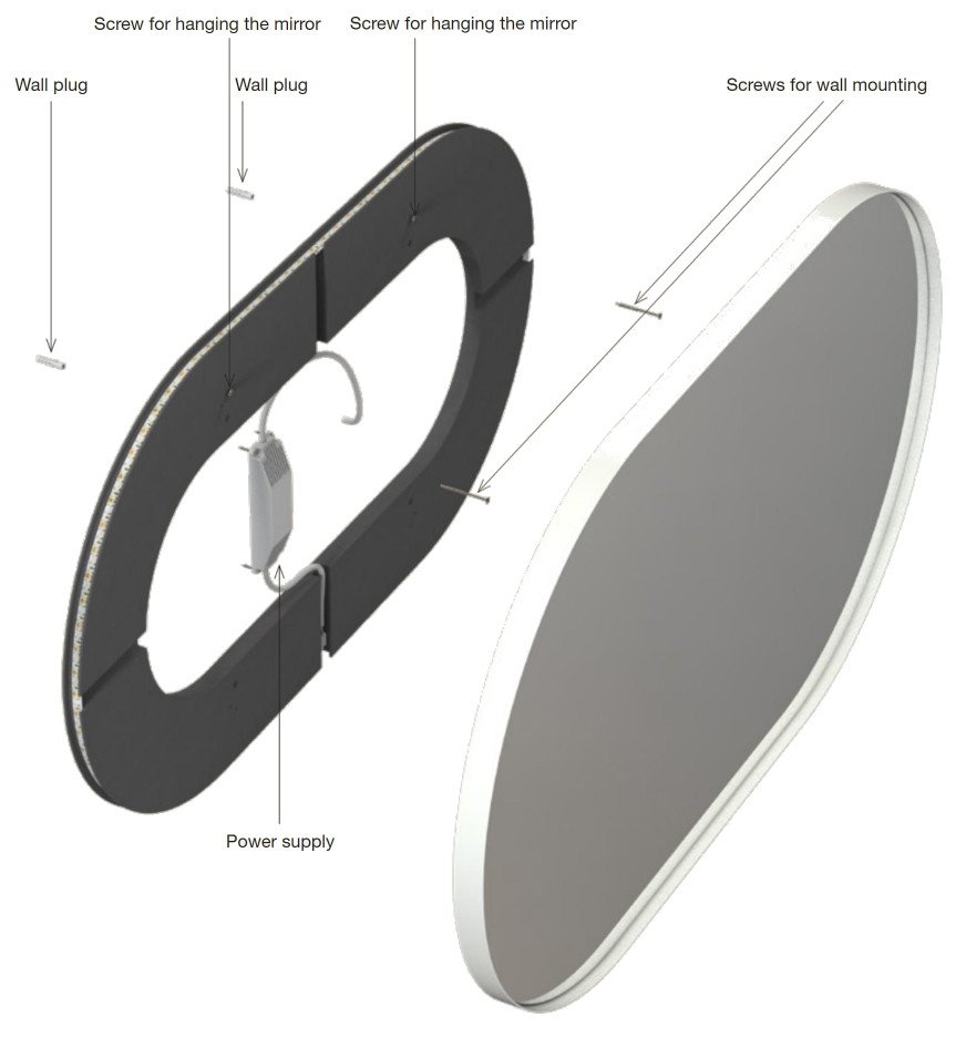 | Compatibility | PLEASE NOTE: This LED panel is ideally suited for Unu mirrors manufactured after October 2025. If your Unu mirror was manufactured before October 2025, the existing holes in the mirror frame will be spaced differently. It is still possible to use the LED panel, but this will require a minor manual adjustment beforehand. In this case, we offer a corresponding drilling template, which we will be happy to provide following a consultation with our Customer Service. |