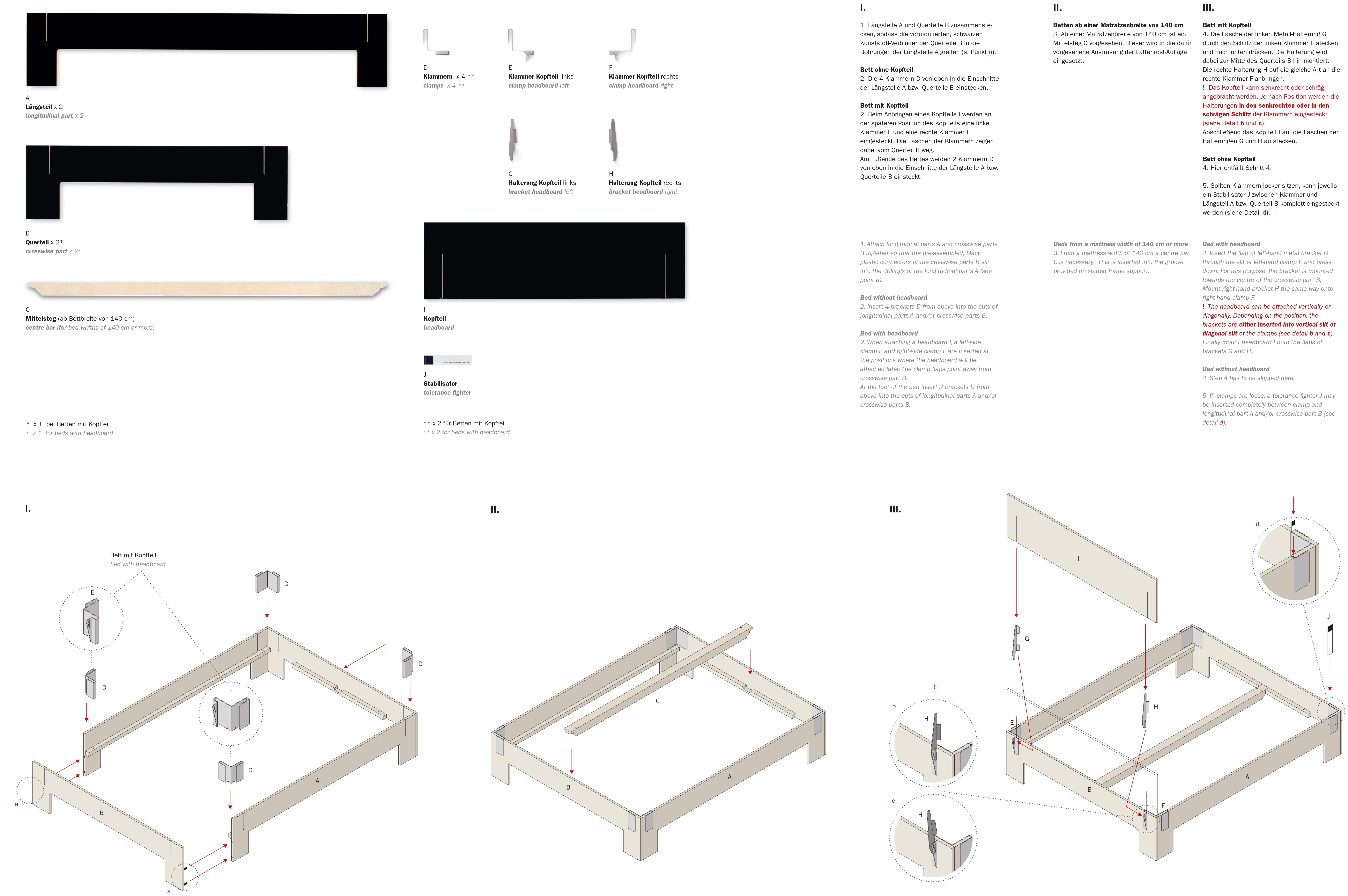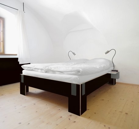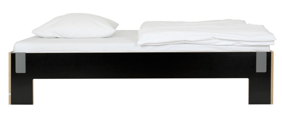 The production of Nils Holger Moormann furniture is carried out by smaller and medium sized companies, largely based the company headquarters in Aschau and who frequently have collaborated with which Moormann for many years. Thus Moormann actively promotes regional structures and integrates the expertise of different professions into the production processes. In many cases, the suppliers are also involved in the development of the first prototypes, working together with the designers on questions of how to best implement the designs for serial production. The choice of materials is based on the practicability and on questions of environmental responsibility. Moormann works primarily with natural, sustainable materials. All woods, for example, are FSC certified and come from sustainably managed European forests. The Tagedieb is produced in two variants, white and black birch plywood with clips of powdered steel. A slatted frame and headboard are optionally available.