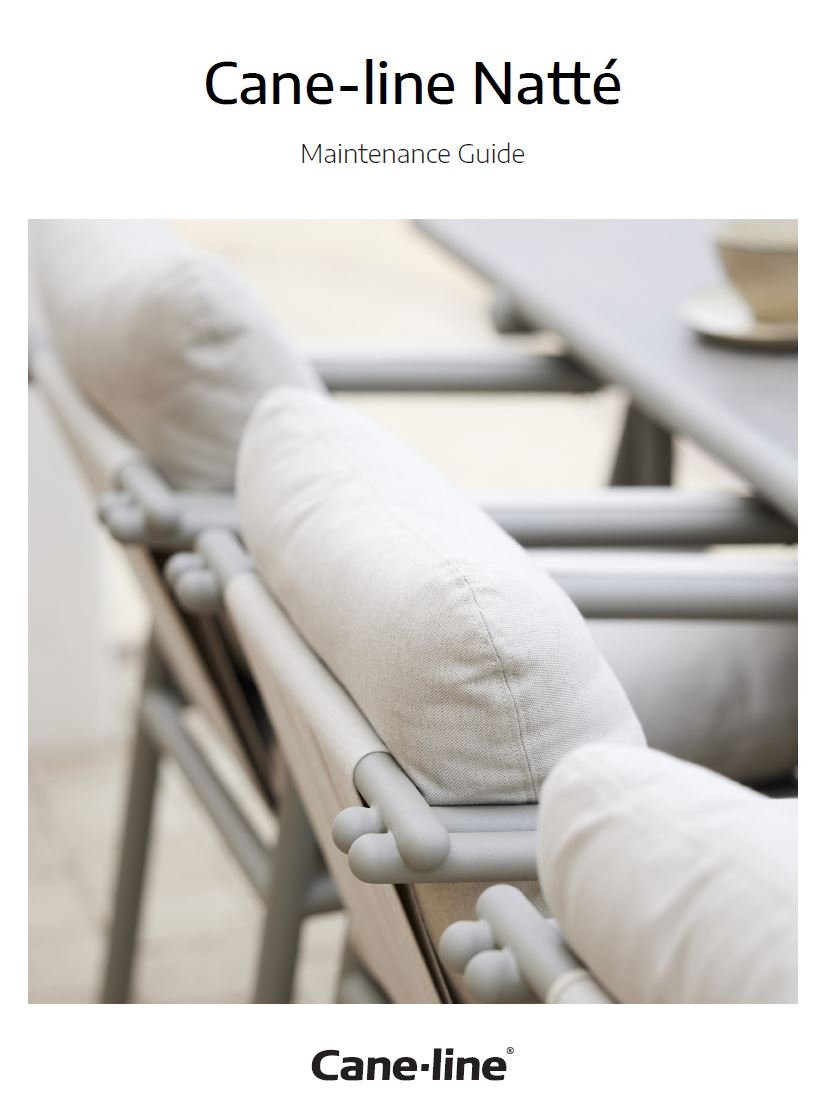 | Care | Lounge chairs Regular cleaning with soap and water is recommended. It is important to protect the furniture from knocks or impacts, as this can damage the powder coating. The furniture can be left outside all year round, but it is advisable to cover it with a protective cover in winter or when not in use. It should be noted that condensation can form under the cover. It is therefore important not to leave the cover on directly so that the air can circulate and the condensation can evaporate. Ideally, it should be stored indoors during the cold season, where the furniture is protected from water, snow and cold. Cushions Stains from food and drink should be washed out immediately with lukewarm water and soap. For stubborn stains, thorough cleaning with a stain remover is recommended. The cushion covers are machine washable at 30° (Delight) or 40° (Natté). Please click on the image for detailed information (approx. 2 MB) ![]() |
