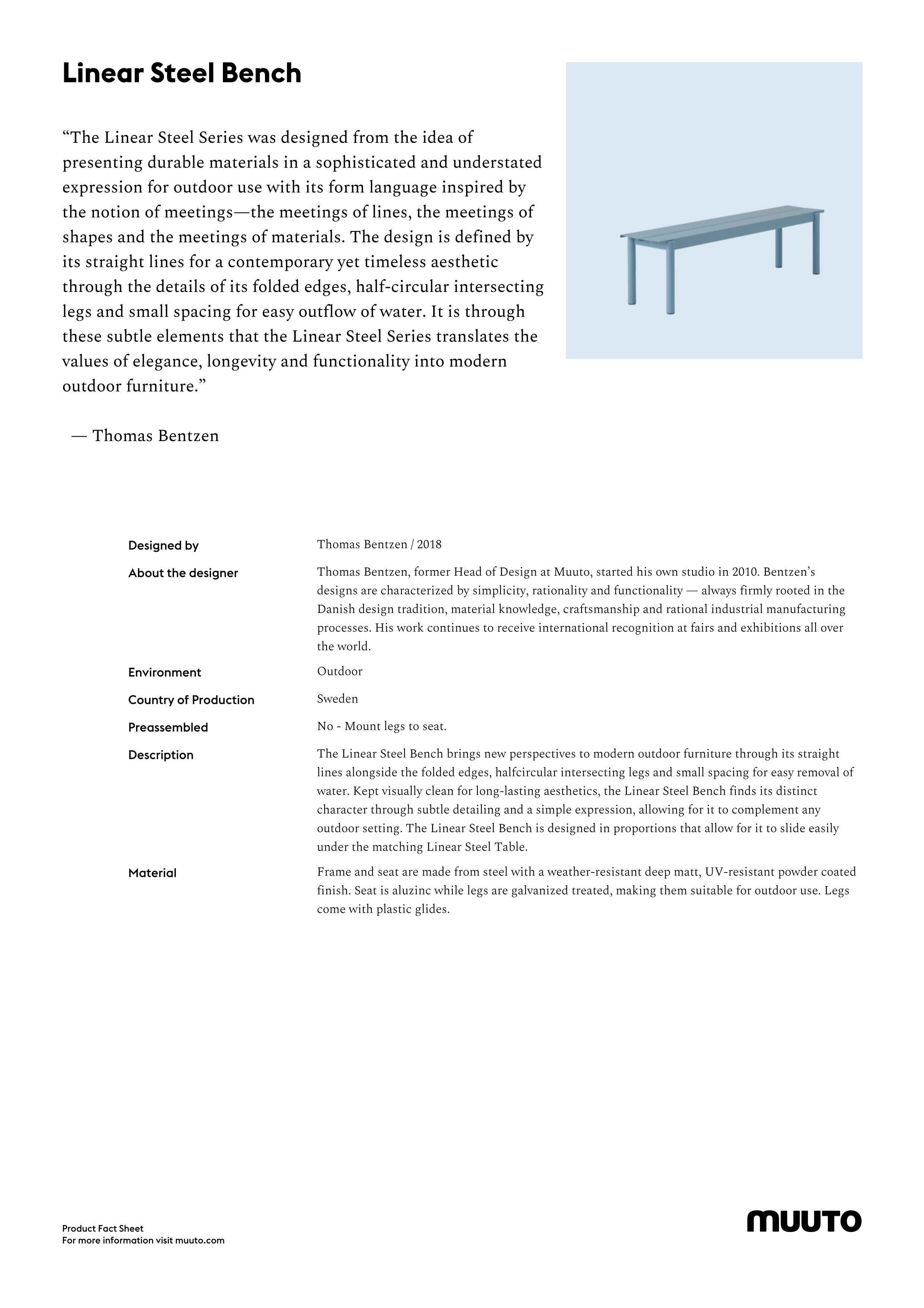 ...Linear Steel Outdoor Series by Thomas Bentzen for Muuto Given the fact that Danish based, Finnish monickered, brand Muuto, are always keen to extol their Nordic origins, including, one assumes, the pure air and soft light of the Scandinavian peninsula, it's strange that the Linear Steel series should represent their first foray out of doors...