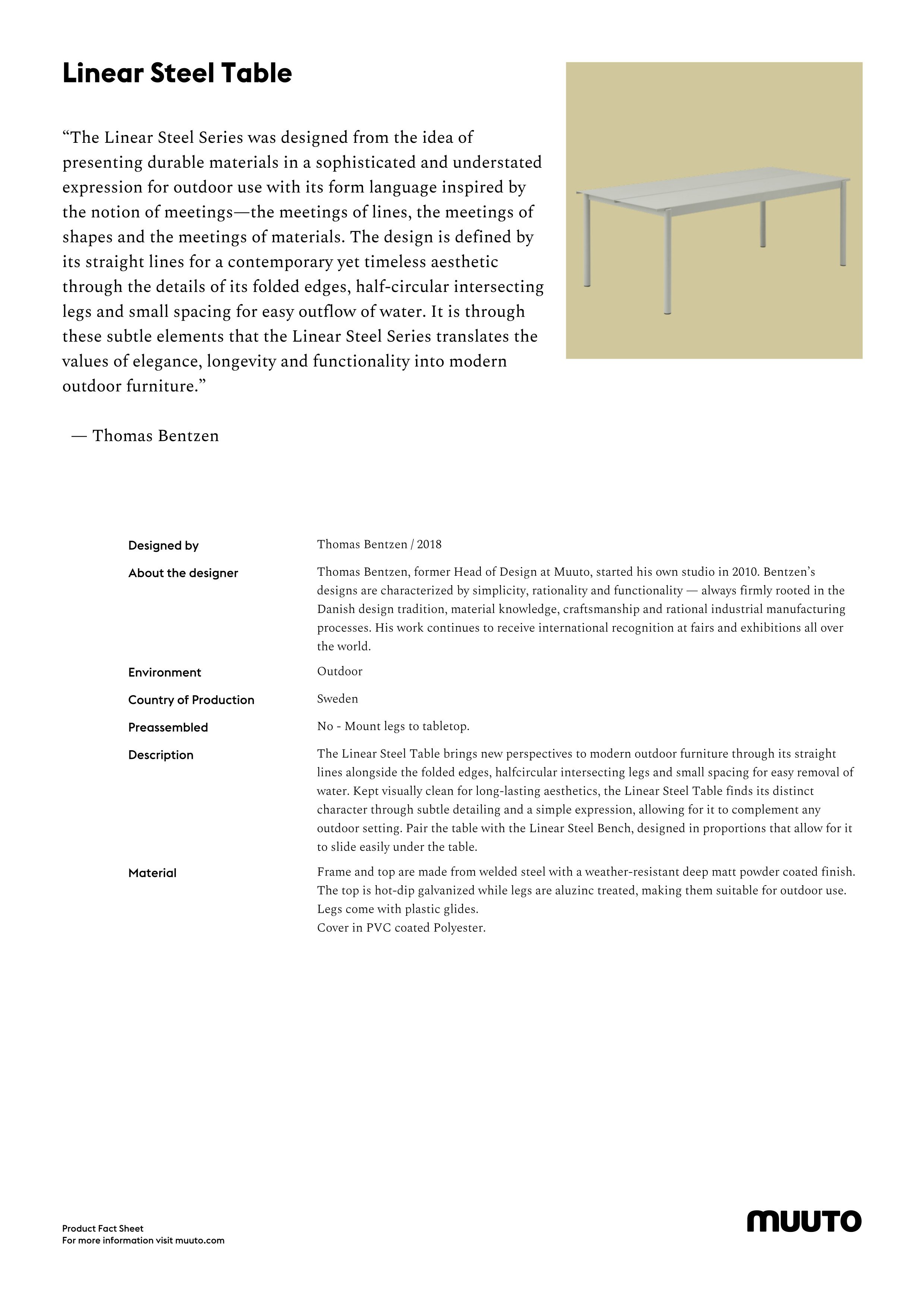 The Linear Steel Table by Thomas Bentzen is one of the first Muuto garden furniture objects and convinces with its combination of clear design language, robust material properties and contemporary colour design. The matching Muuto bench from the Linear Steel collection creates a stylish sitting area for balmy summer evenings.