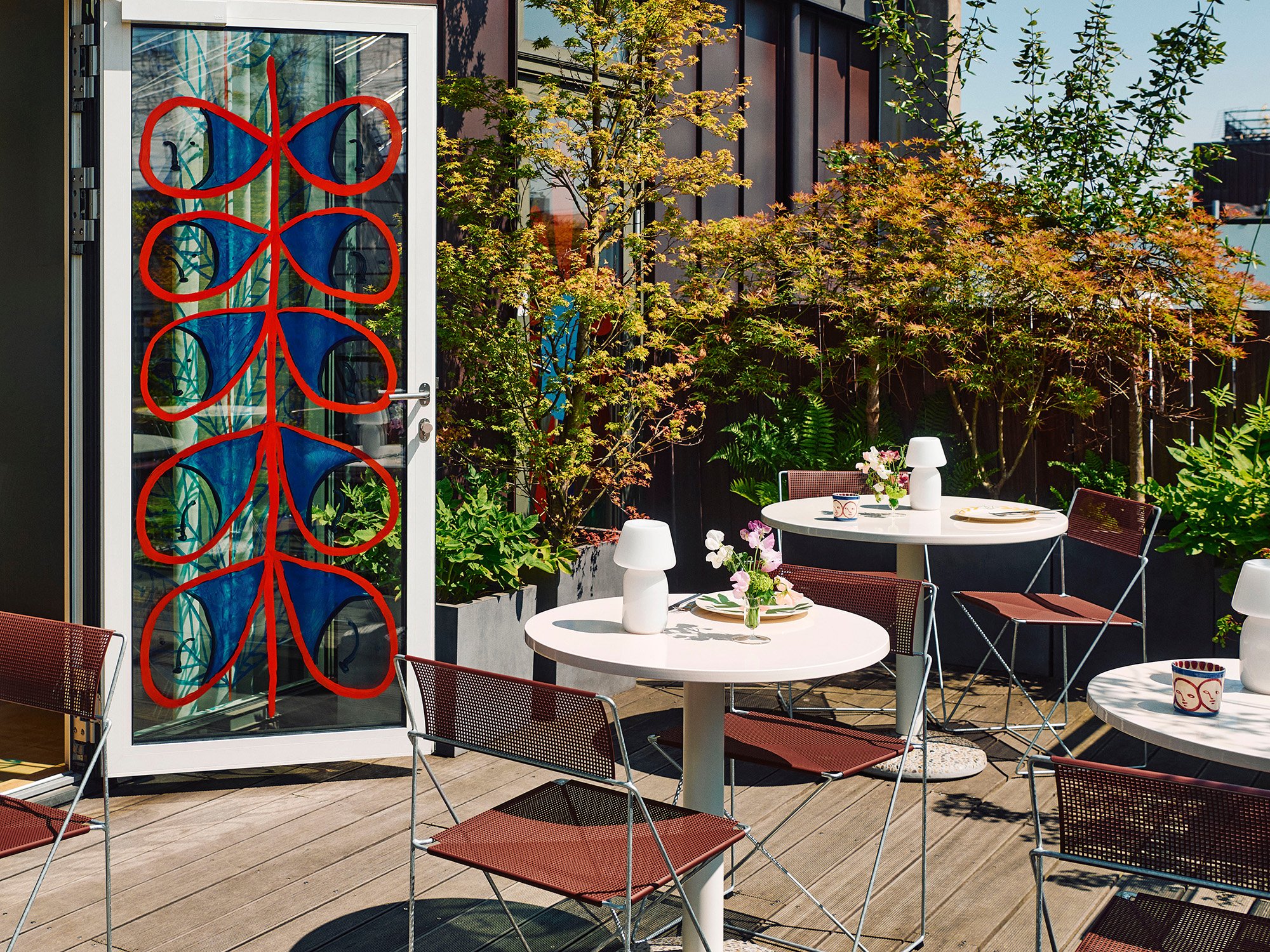 A harmonious, summery ensemble specially designed for the outdoors: the X-Line chair, the Ceramic table and the Apollo lamp.