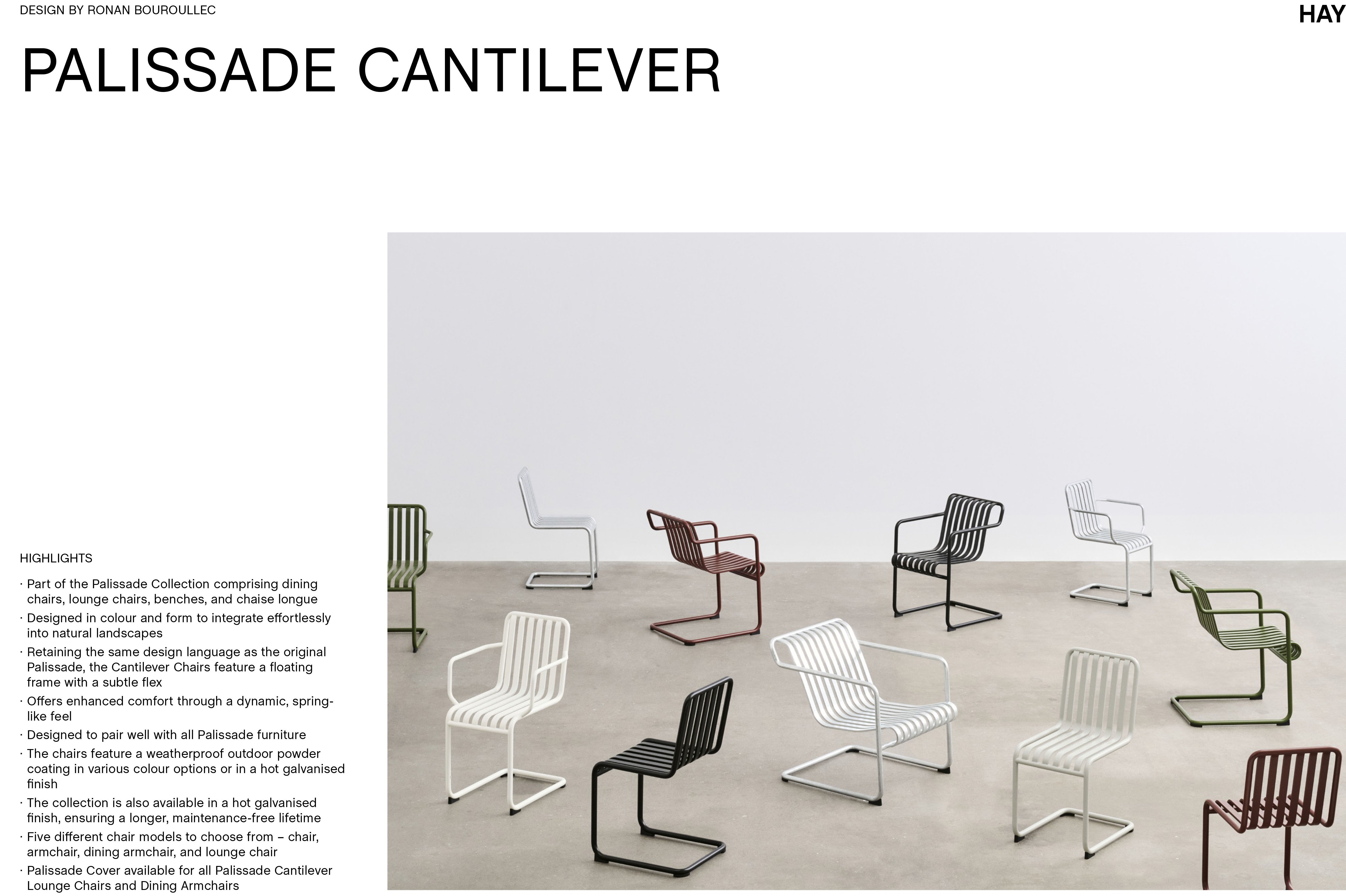 The Palissade Dining cantilever chair designed by Ronan Bouroullec gives the iconic outdoor series a particularly graceful expression thanks to its floating frame construction. The retention of the characteristic, symmetrical design language guarantees the timeless aesthetics of the original design. Thanks to the gentle yielding of the material, the chair offers a high level of comfort and a pleasant sitting experience - perfect for cosy summer evenings outdoors.