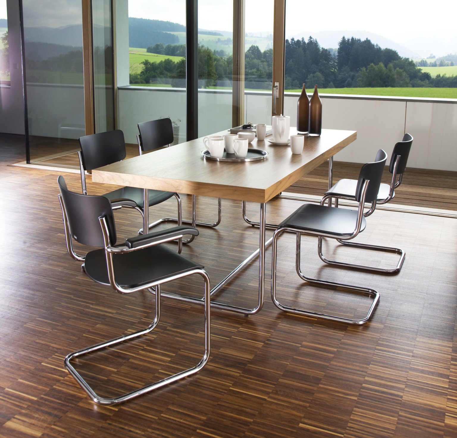 The Bauhaus furniture designers refrained from using unnecessary decorations and colour, and instead used simple but strikingly chrome plated surfaces complemented by the regular use of black. Steel tubes offering as it does numerous benefits, such as high load bearing capacity, low raw material costs, low weight and good formability, greatly contributed to the resulting exceptional design and ease of transportability. The plywood used for Bauhaus tables and chairs consisted of several thin wood layers glued together, which ensured an ease of moulding. However, the typical curved shapes were also created because the welding work could thus be minimized. The use of glass in table tops formed a direct link to the architecture of the time, which focused on the use of glass and steel in the construction of new buildings. Reduction in Bauhaus design is particularly present in the case of the cantilever chairs, where the traditional 4 leg frame was dispensed with. The combination of tubular steel with a wicker mesh makes Thonet furniture the very epitome of Bauhaus furniture design.
