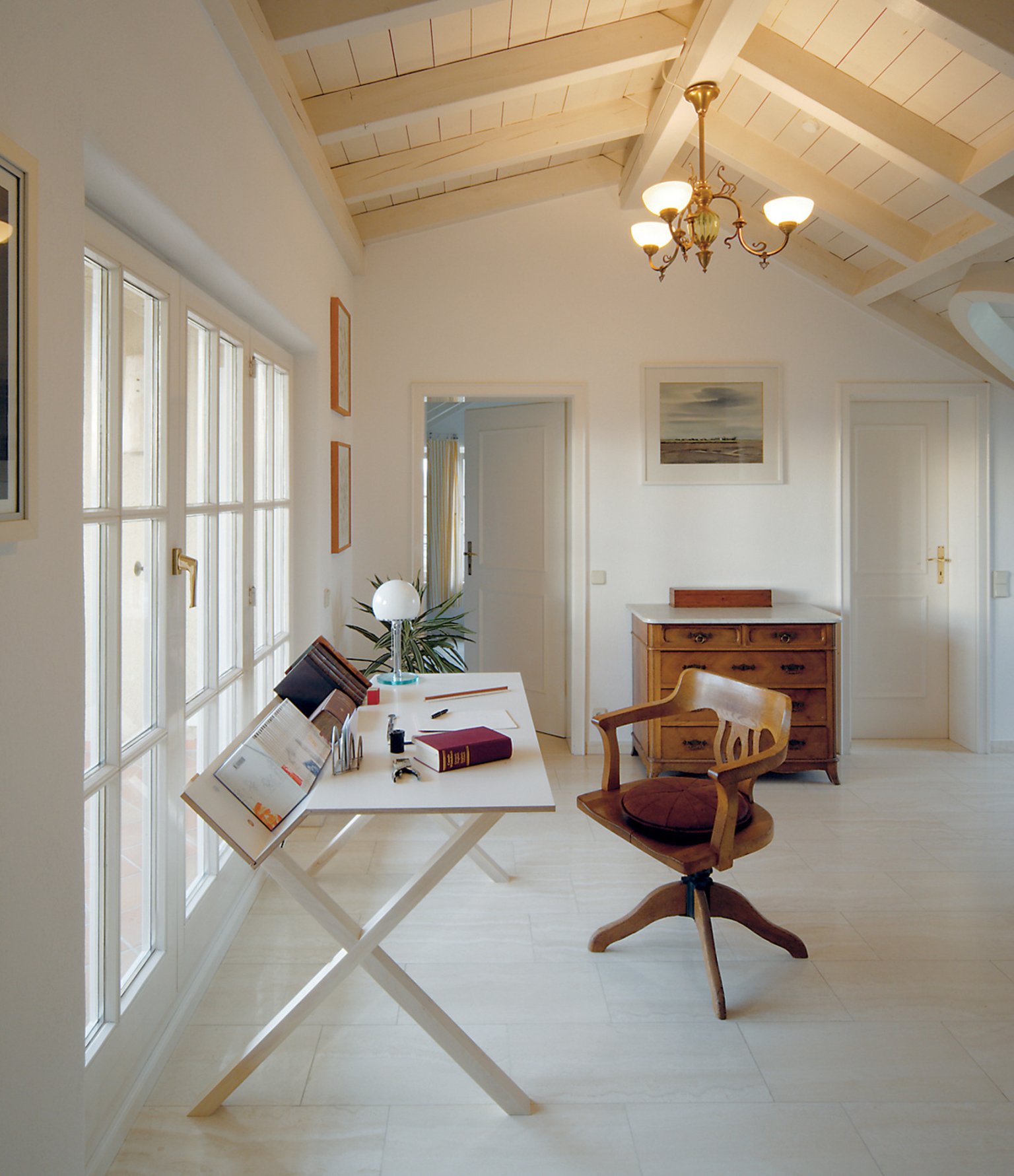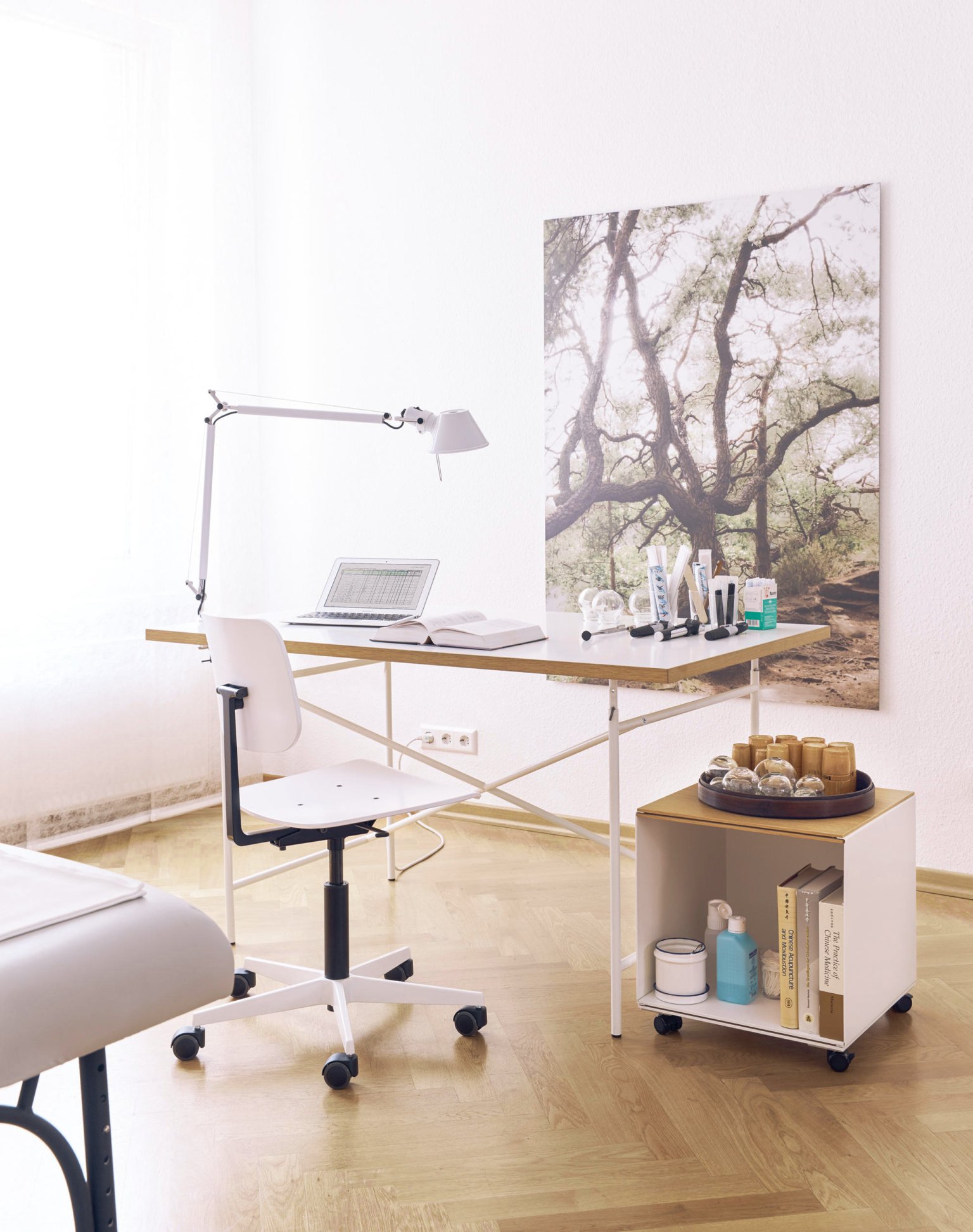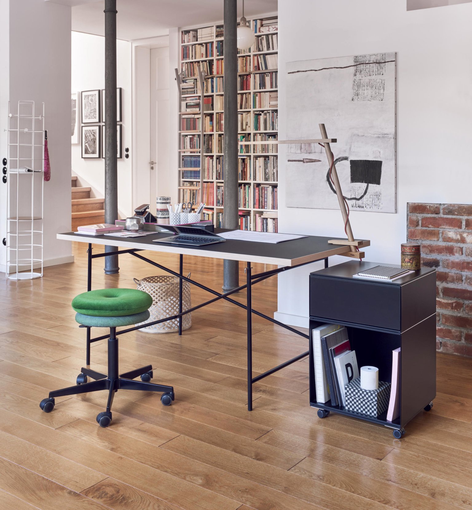 When setting up your own study, there are no limits to personal taste, but of course it is important to observe the requirements of the room. When choosing the right desk, functionality and often size are the focus. A popular, and thanks to its minimalist design language, especially with architects popular design classic is the spacious Eiermann desk. The Eiermann table frame was designed by the German functionalist Egon Eiermann, and can be combined with an Eiermann table top in various sizes and designs and thus meets very different requirements. For productive work, choosing the right lighting is also essential: desk lights should be flexible and dimmable to allow for prolong periods of work on the computer. An absolute classic and a functional jewel is the Tolomeo Tavolo desk lamp by Artemide. Equally important is the choice of a desk chair in the home office. Models such as the Vitra Physix are no compromise in terms of functionality and ergonomics, but thanks to their compact technology and particularly elegant design they blend perfectly into the living area.