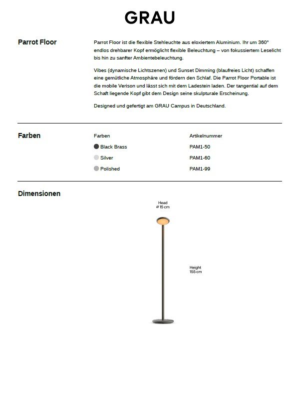 The Parrot Battery-Powered Floor Lamp from Grau is a new version of the tried-and-tested floor lamp. Crafted from precisely machined, anodised aluminium, the Parrot stands out with its 360° rotatable lamp head. Its flexible lighting ranges from focused reading light to soft ambient lighting, while a variety of lighting moods create a cozy atmosphere. Thanks to its long battery life it offers a versatile light source for reading on the sofa, armchair, bed, or for discreet room lighting.