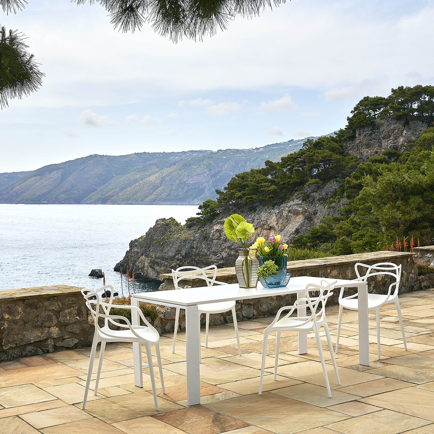 Kartell furniture accompanies you all year round – both indoors and outdoors. Whether in the warm spring sunshine or in the fresh sea breeze: with Kartell you can enjoy stylish design outdoors. Those who love metal will find what they're looking for in the outdoor furniture of the Hiray Collection, a collection characterised by its light, airy wire structure that is perfect by the pool or on a terrace with a sea view.