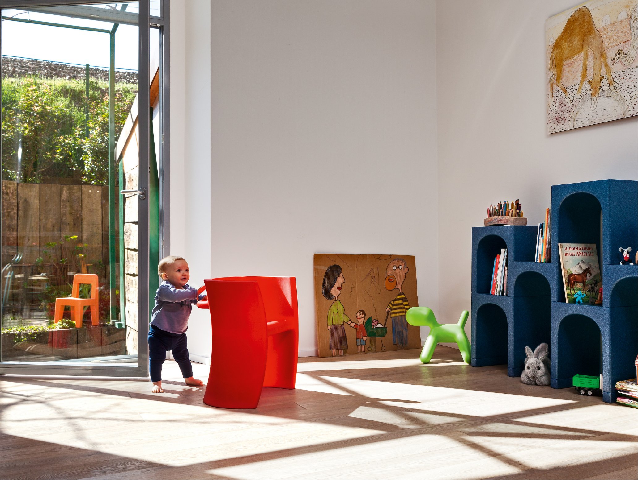 For children, the world looks very different than for adults, something that must always be borne in mind when selecting furniture for children. Remembering our own childhood, we know what is important and fun: and that kid's furniture is exposed to higher loads and ideally should be able to serve as a toy. Designers have long come to the conclusion: Ray and Charles Eames designed objects especially for children, such as the Eames Elephant, and which gained not only worldwide recognition as a children's toy, but also as a decorative object. An entire range of children's furniture has been launched by the Italian manufacturer Magis in form of their Me Too Collection, and which includes designs such as the Julian chair by Javier Mariscal or Marcel Wander's Little Flare children's table and which blur the lines between toy and furniture design and give the imagination free rein.