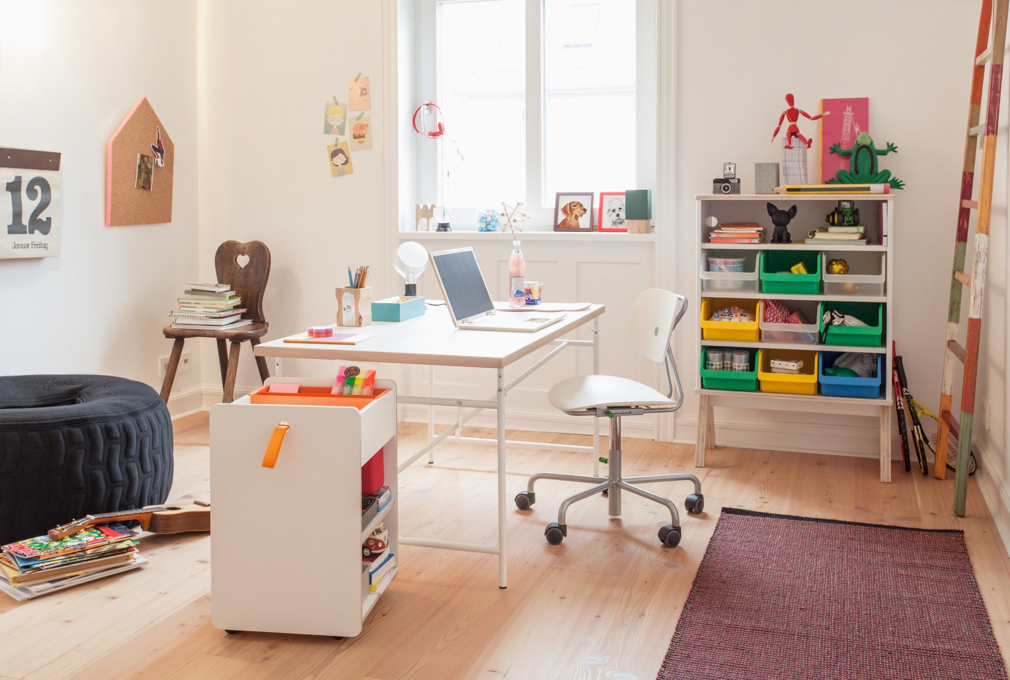 Numerous renowned furniture manufacturers now offer smaller versions of their iconic designs, objects tailored to the needs of children – both in terms of their proportions and functionality. Examples include the Panton Junior by Vitra, the Series 7 children's chair 3177 by Fritz Hansen, or the S 43 K by Thonet: They are in no way inferior to their larger counterparts in terms of quality and design rather are optimally tailored to children's dimensions. While via extension rods the Eiermann children's desk can be used by children from preschool ages until the end of the secondary schooling.