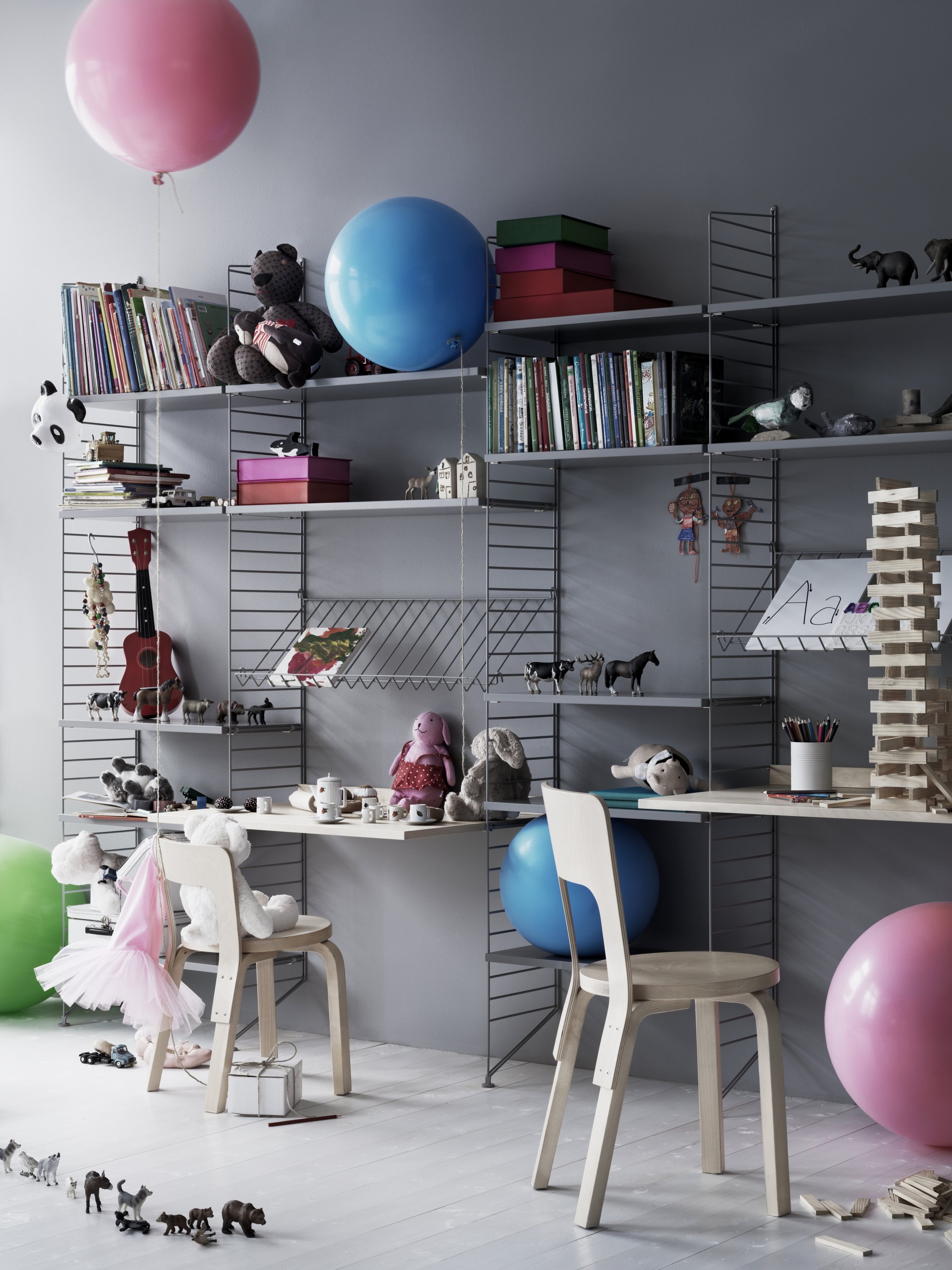 The repeatedly expandable String shelf also makes itself useful in the nursery