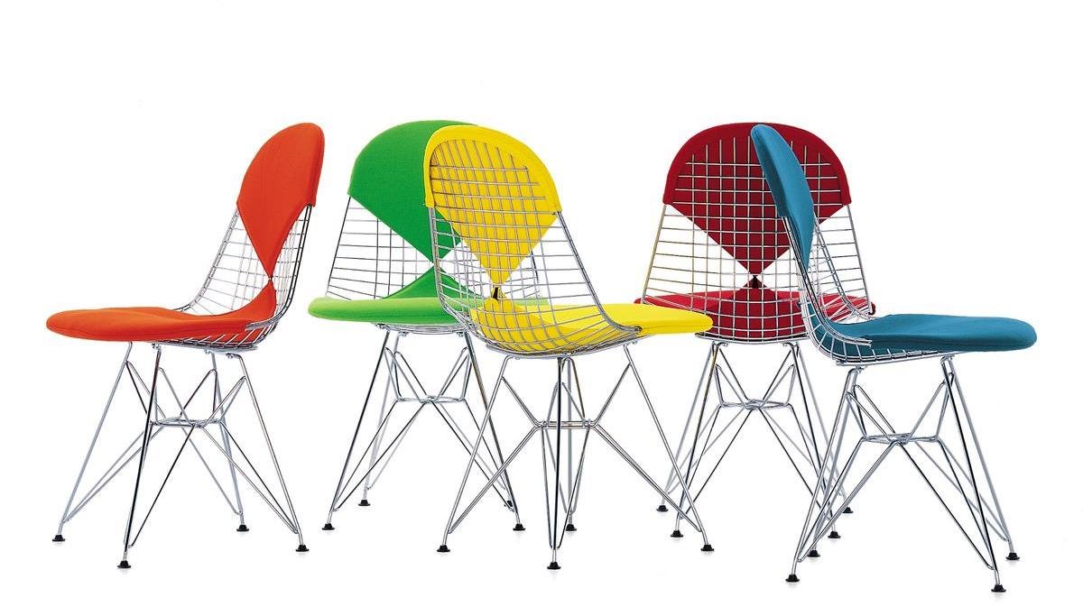 The furniture designs the Eames's are rooted in the functionalism of American modernism of the postwar period. Charles and Ray Eames developed a clear, functional designs, such as the Plastic Chairs that precisely matched to the needs the people of their time, and often experimented with advanced production methods and new materials. With its unmistakable character the Eames Wire Chair DKR is not just aesthetically charming, but reminds us of the emergence in the 1950s of popular culture: a movement which in terms of furniture design brought decorative elements back to the forefront With its cool, shiny steel wire and "lascivious" bikini shaped padding the Vitra Wire Chair Bikini represents more than most other furniture objects the decadent pop culture of 1950s America.