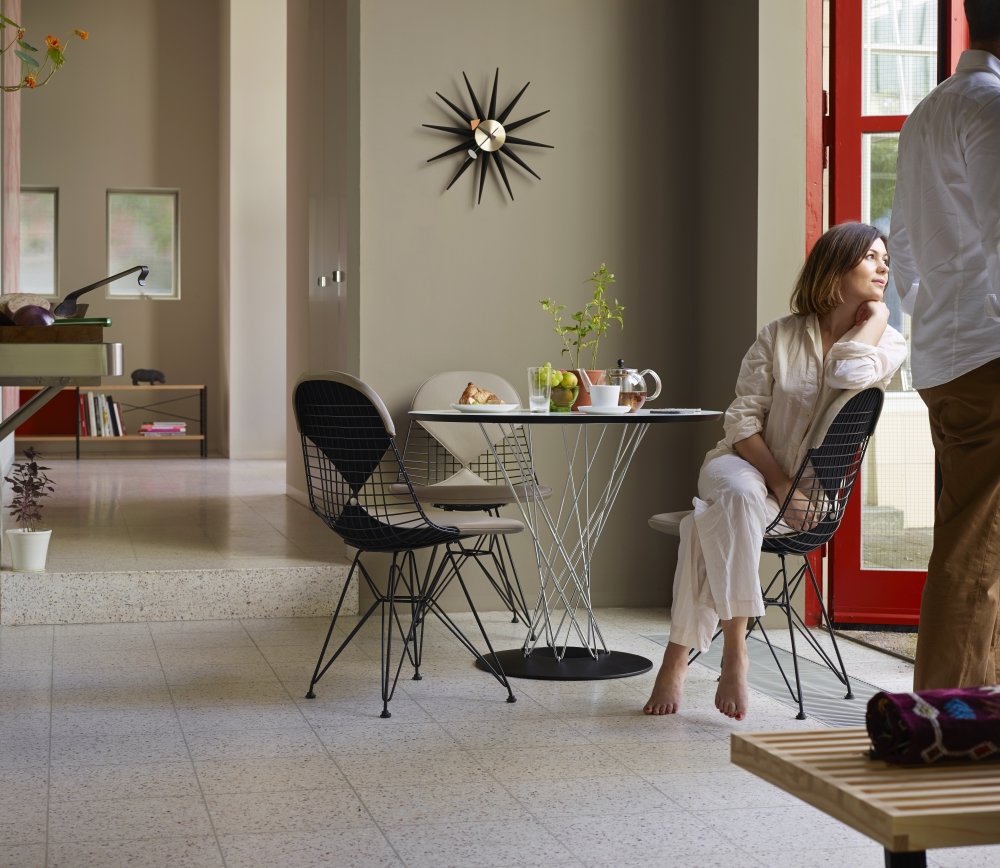 Dining room with various Vitra furniture objects, including the DKR Wire Chair Black