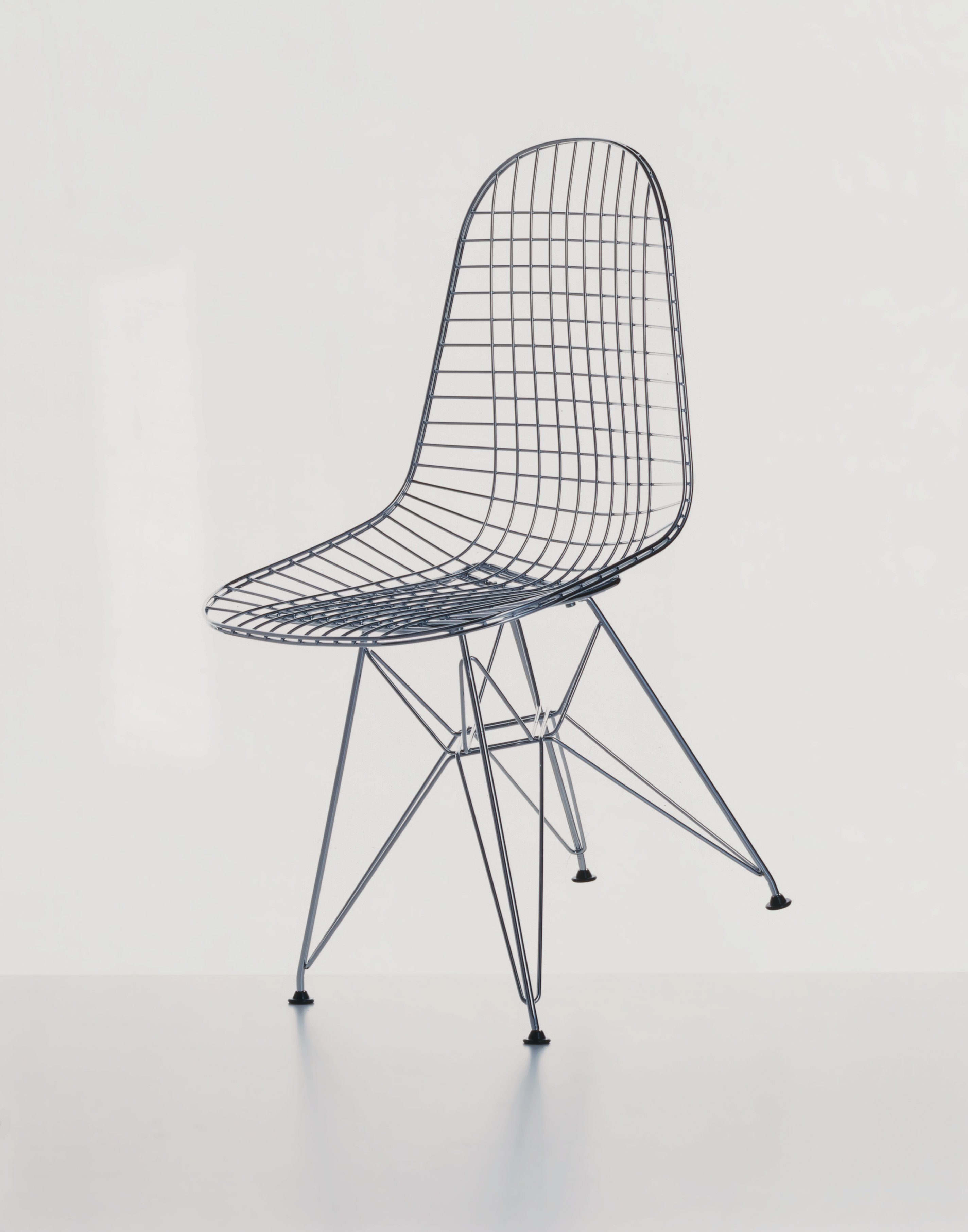 With the Vitra DKR Wire Chair Charles and Ray Eames developed a formal adaptation of their legendary plastic chairs; however, instead of fibreglass the Eames realised a one-piece seat shell crafted from welded steel wire. The striking feature of the Eames Wire Chair DKR is therefore, in addition to the organic shape of the seat shell, the symbiosis between seat and frame: the so-called Eiffel Tower base existing in formal and optical harmony with the seat shell. In addition, and as with the Eames plastic chair family the Eames wire chair shell can also be combined with other bases if required. Vitra has produced the Eames Wire Chair, since the 1950s. In 2013/14 Vitra released a version in a black powder coat finish, the DKR Outdoor, which is also suitable for outdoor use, and launched the DKW, the seat shell from steel wire combined with the well-known base from the Eames DSW.