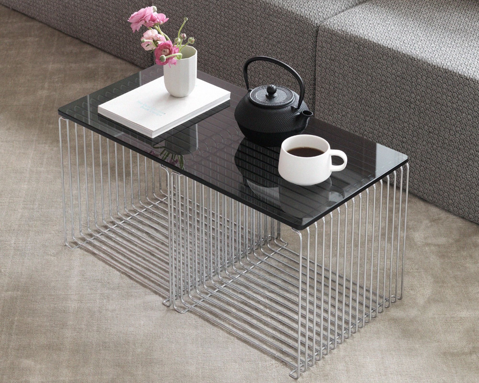 Available in numerous sizes and variants, the modular Panton Wire shelf combines a filigree wire structure with flexible expandability and versatile use as a wall shelf, sideboard or side table in the entire living and working area. Designed in 1971 by Verner Panton Panton Wire cubes reflect the interest in modular systems, industrial materials and transparent structures that characterised furniture design at the time.