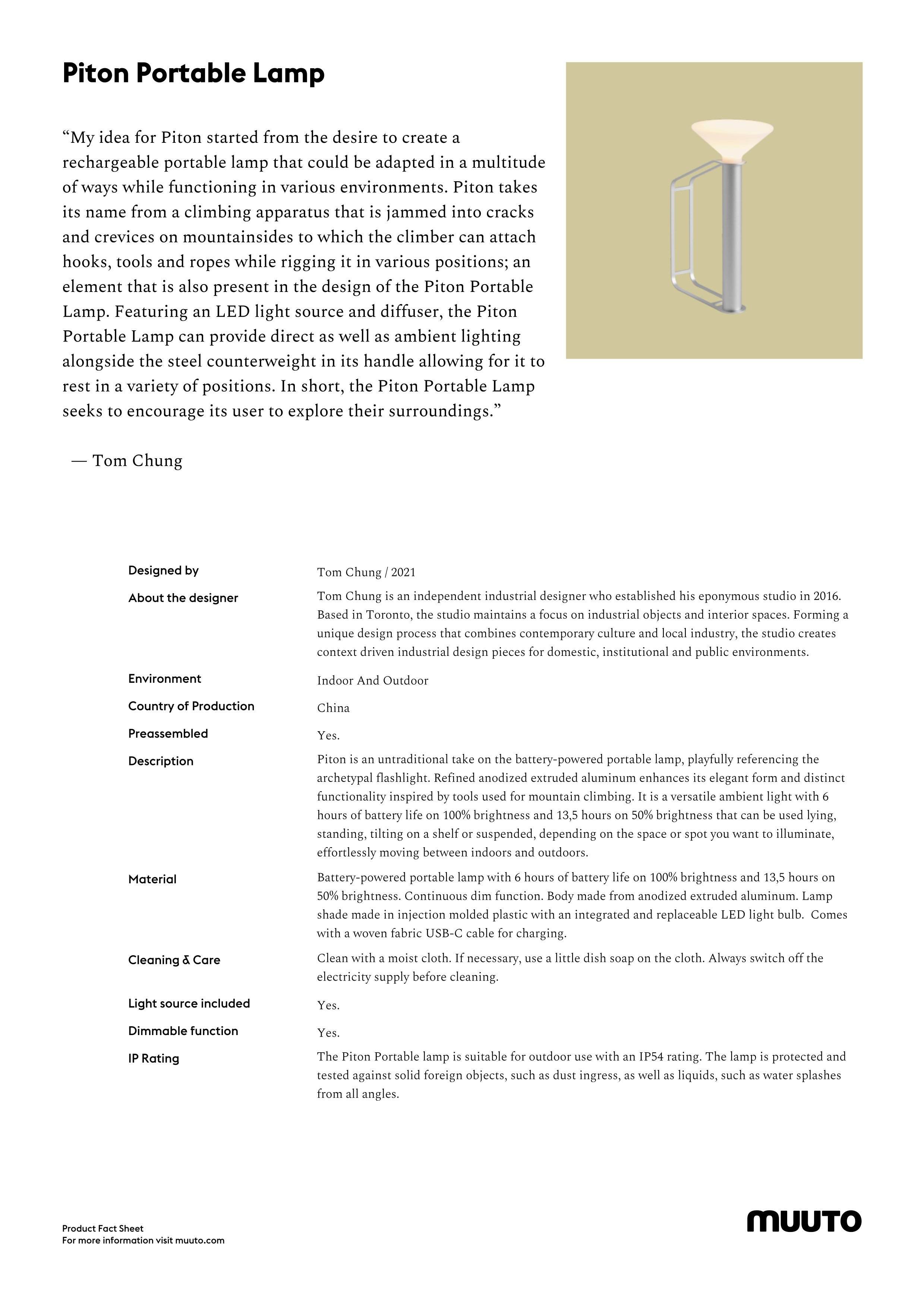 The Piton Portable Lamp for Muuto by designer Tom Chung was inspired by the functionality of outdoor equipment and named after the rock hooks that are essential for any adventure climbing. The Muuto lamp embodies the playfulness of a flashlight and effortlessly emits direct light standing, tilting or hanging. Indoors and outdoors.