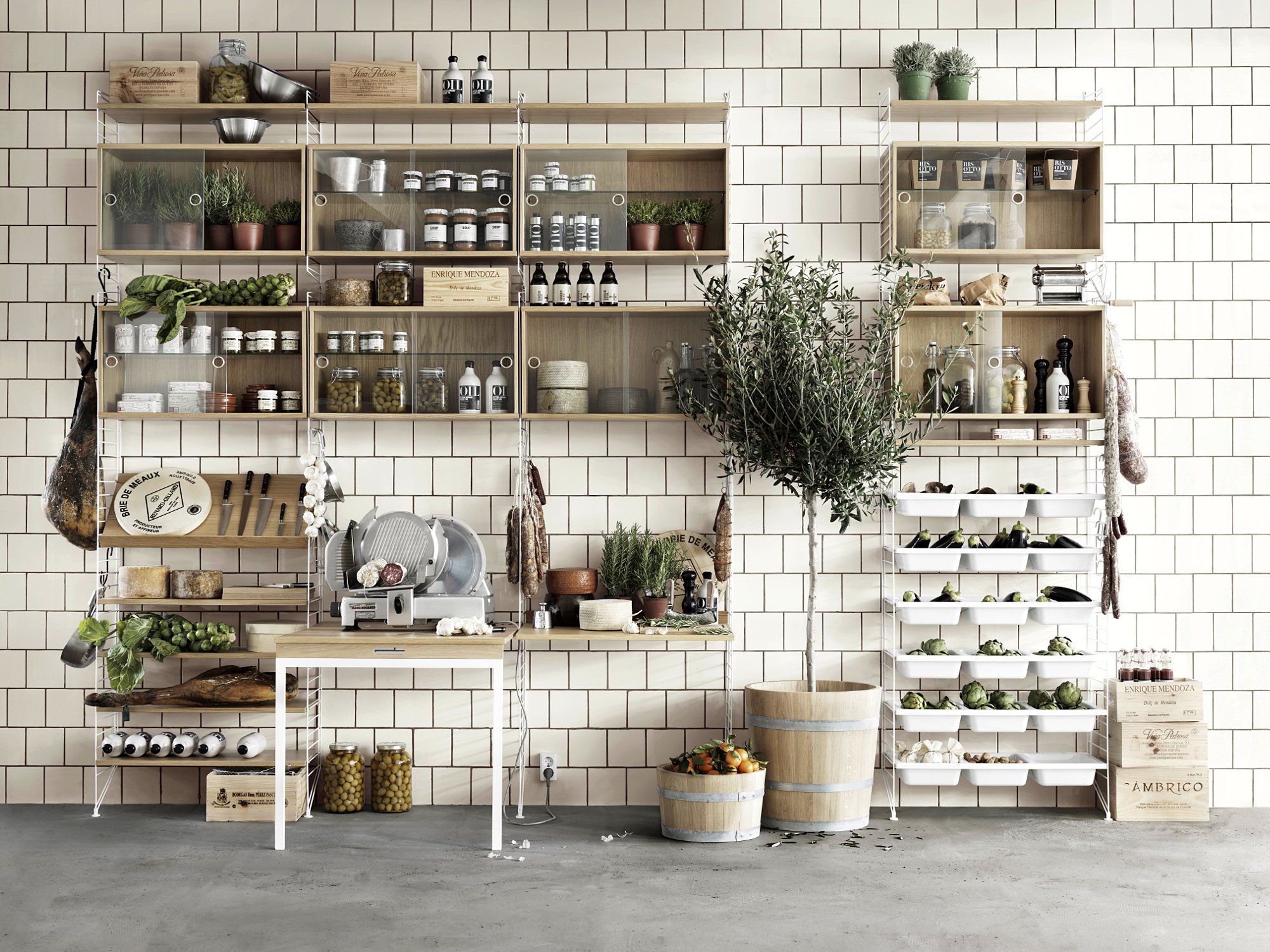Function & properties The String shelving system can be configured individually. Shelves and components can be added to the side panels as required.