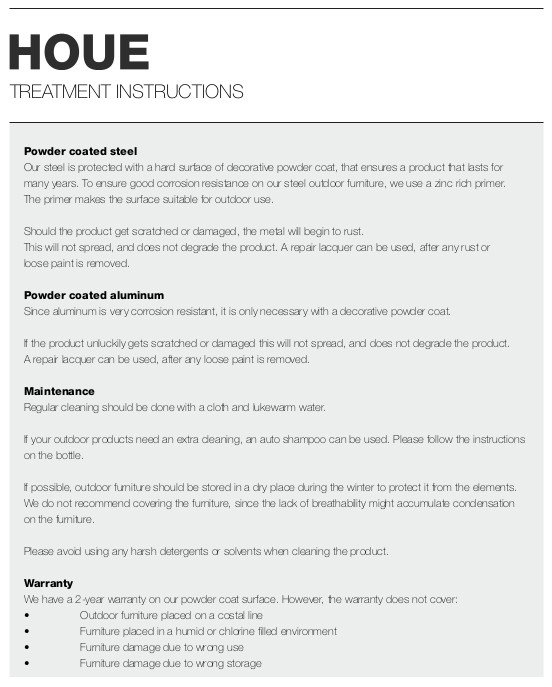| Material | Frame: aluminium, powder-coated Cover: "Heritage" (50% recycled acrylic, 47% acrylic, 3% polyester), water-repellent, stain-resistant and Oeko-Tex-certified |