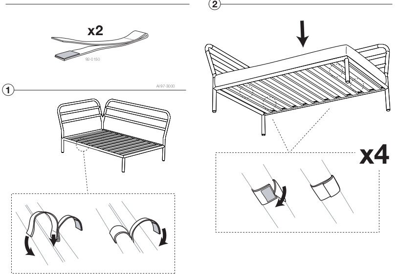| Assembly | Seat cushions are attached to the frame using straps. Please click on the image for detailed information (approx. 0.5 MB)![]() |
