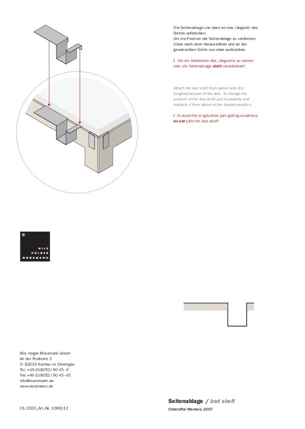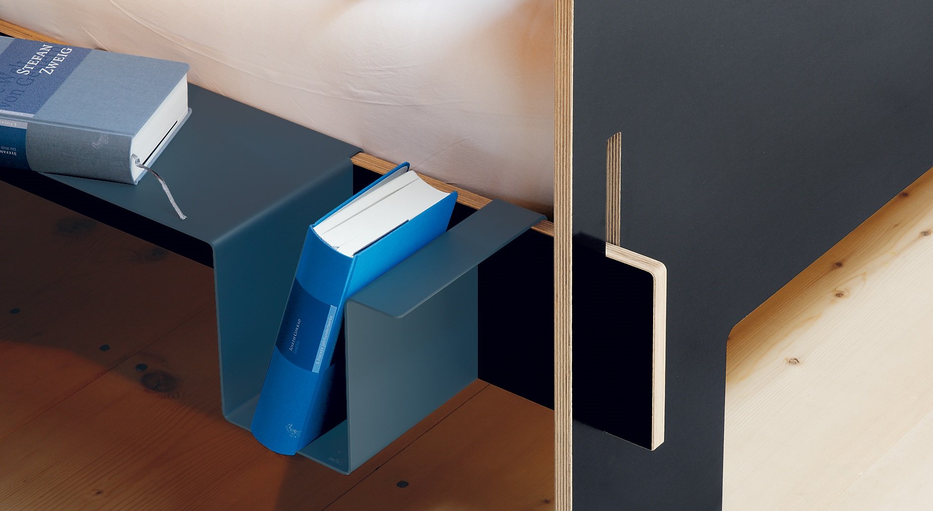 Even if the Siebenschläfer/Tagedieb side shelf is "just" a supplement to the bed range of Nils Holger Moormann, they are classic Moormann products in terms of design, innovation and functionality. Just as Moormann's Siebenschläfer and Tagedieb beds can be easily, and tool free assembled, so can the one-piece aluminium side shelf be simply placed on the bed frame. Plug and play for the analogue world! And if the frame thickness happens to be 18mm, this easy night table can also be used on and with any other bed. Typical Moormann is also the functional, minimalist look: crafted from anodised or powder coated aluminium the Moormann side tables consist of a single, bent piece of metal and features a deeper shelf for books and a larger area for glasses, alarm clocks or the like: thus the Moormann side shelf fulfils all the functions of a classic night table without taking up unnecessary space.