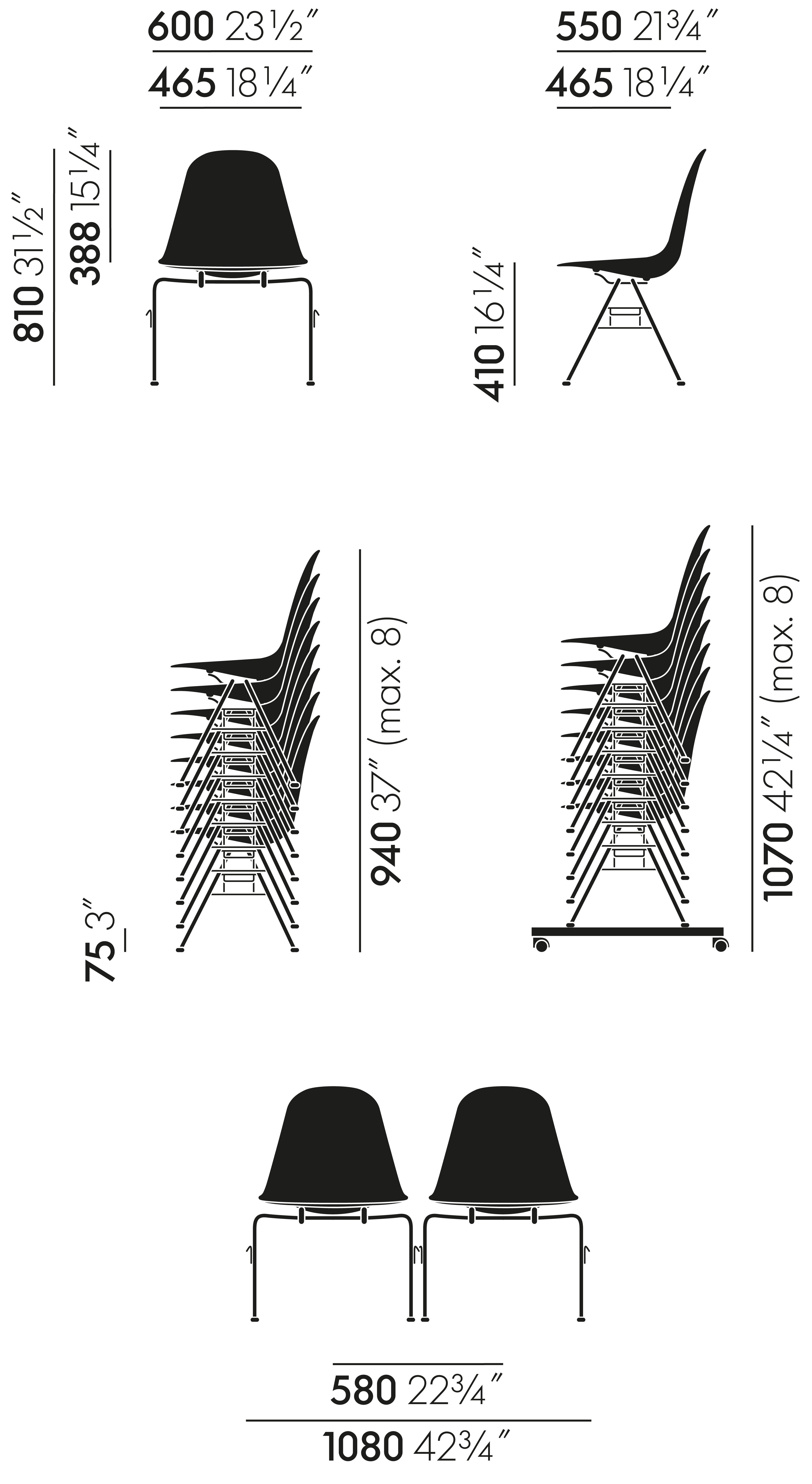 The success story of the Swiss furniture company Vitra began in the 1950s with Charles and Ray Eames when company CEO Willi Fehlbaum came across Eames designs on a trip to America and subsequently secured the licensing rights for Europe. In 1948 the future Eames seat shell was presented in context of a competition run by the Museum of Modern Art in New York - and promptly received wide acclaim. Dissatisfied with the formally limited materials of their time, such as aluminium or wood, Ray and Charles Eames experimented with a fibreglass reinforced polyester resin and the subsequent, and revolutionary, Plastic Side Chair family unifying everything that Eames hope to achieve with their furniture designs: high quality products that are affordable for as wide a public as possible. Produced and distributed today by Vitra the popular series of Eames chairs are perfectly suited for situations where flexible, yet comfortable and ergonomic, seating is required. Available in many designs and colours the Eames side chairs all present the same characteristic visual lightness; the peculiarity of the Vitra DSS lies in its frame, which can be coupled via row connectors to DSS chairs. Thus the Vitra DSS is perfect for the construction of stable and straight rows of chairs, and thus is especially suitable for lecture halls or other multi-purpose venues. Alternatively the Vitra Side Chair is also available as the DSS-N without connector.