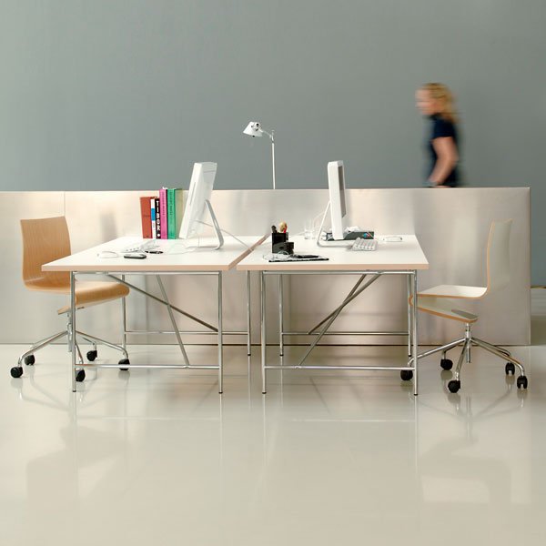 The industrial castors turn a static Eiermann table frame into mobile office element that can be effortlessly transferred from A to B and back again as required. And with each set conatining two castors with a brake, security is also included. Through the castors the table top height is raised by 70 mm