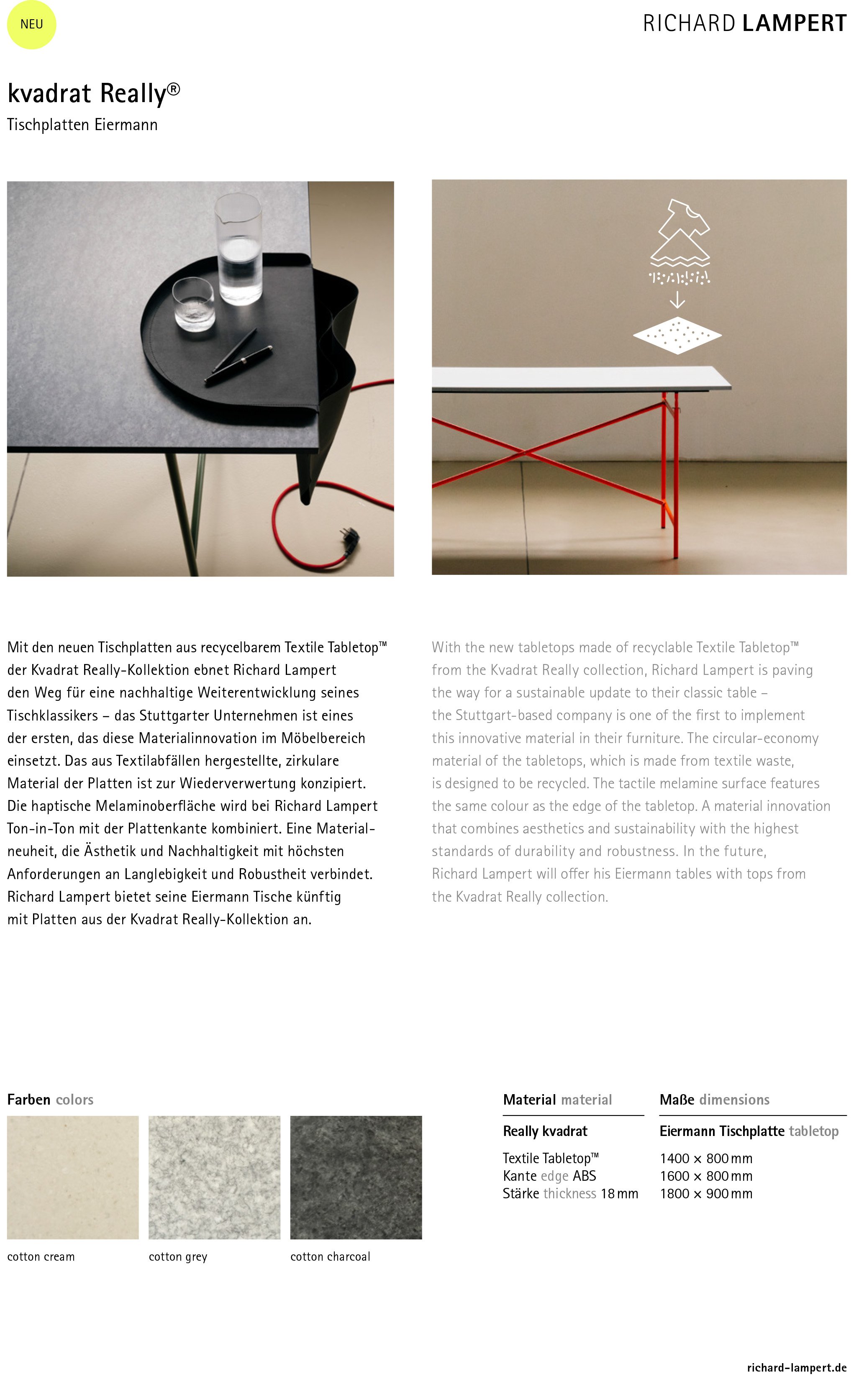 | Material | Table top: Textile Tabletop™ (recycled cotton and wool, 100% recyclable) ABS edge: colour matched to the table top |