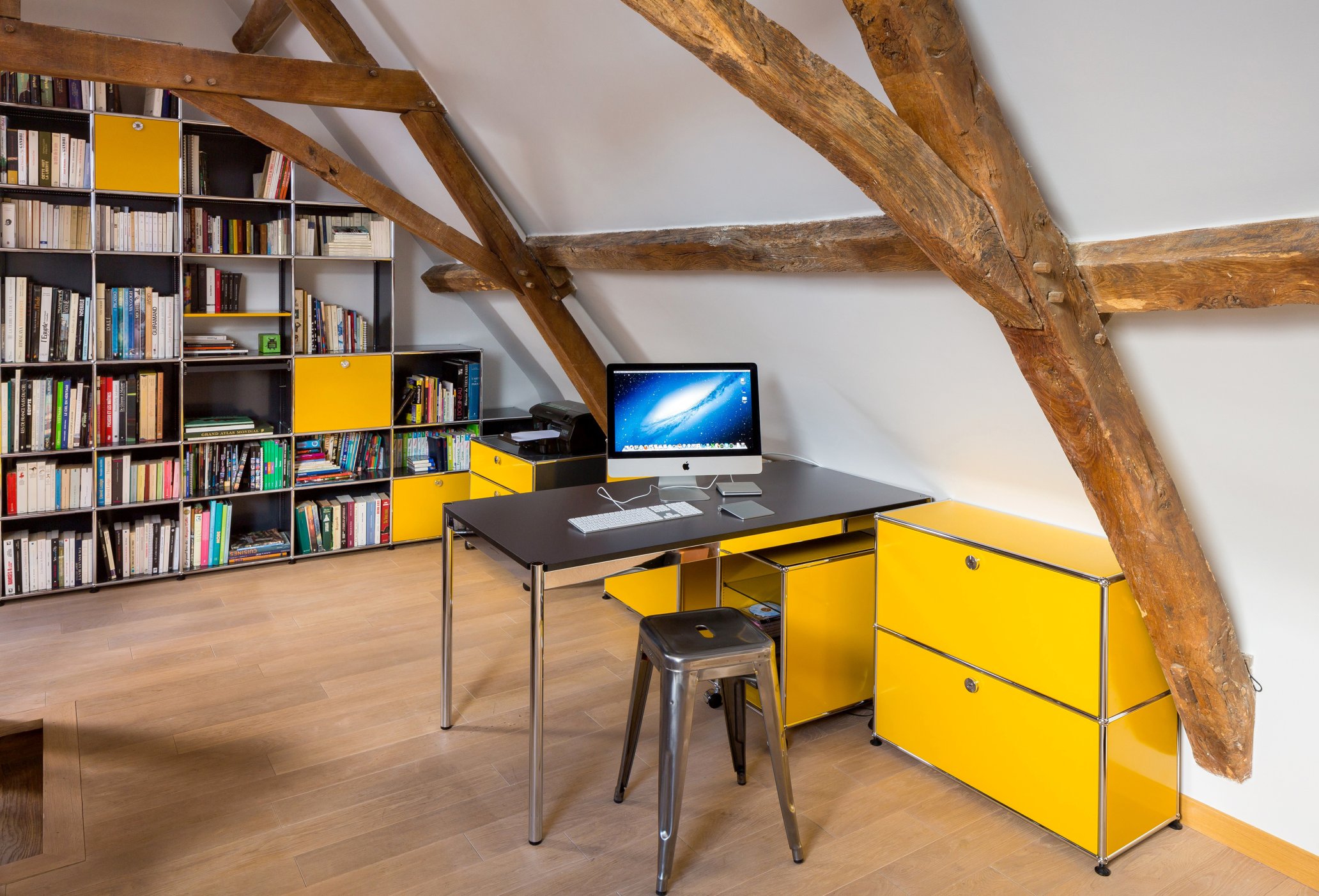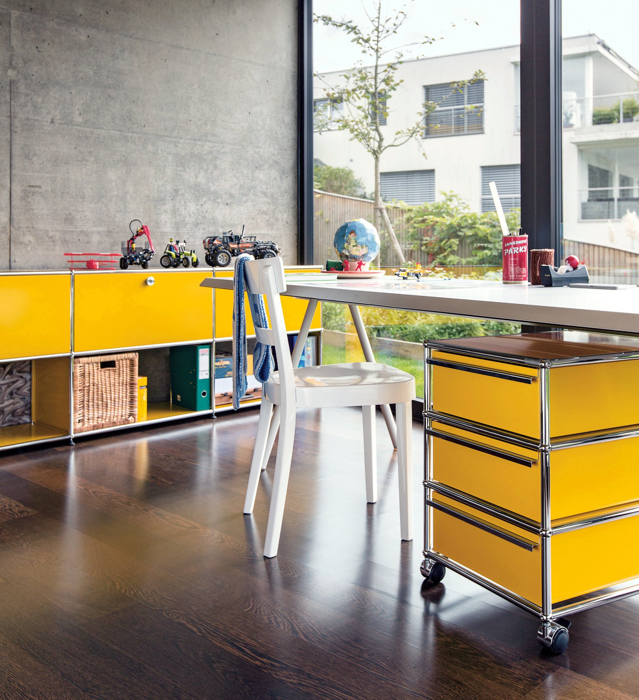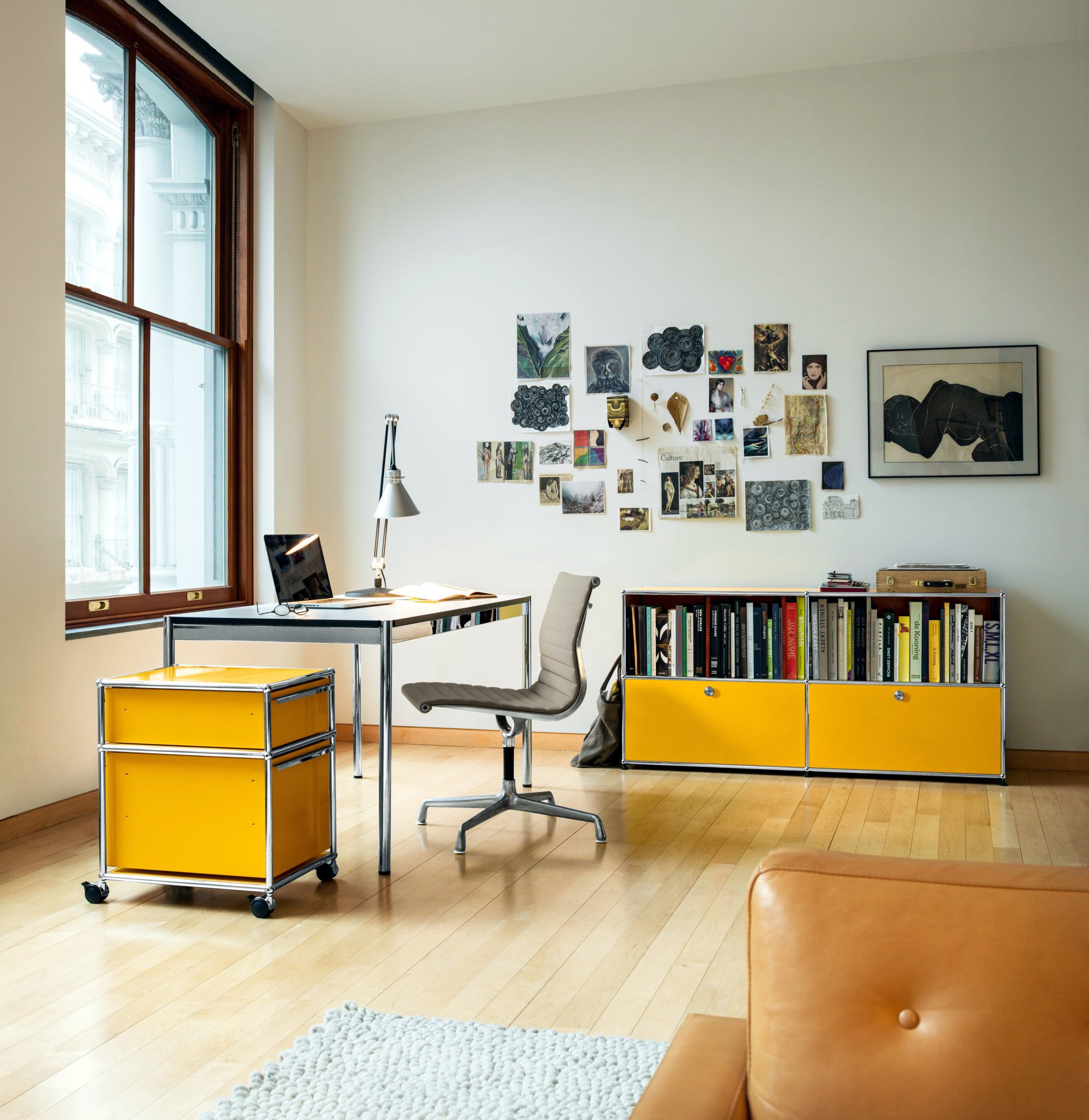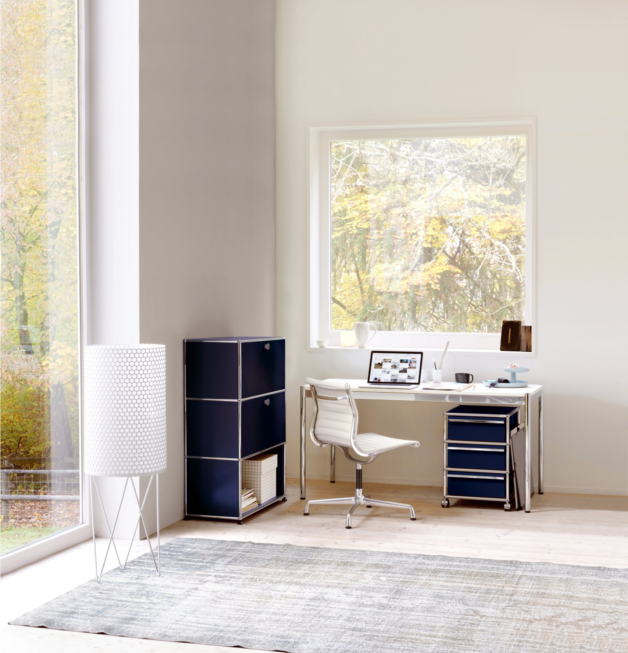 A USM desk and mobile pedestal in the study complimented by an ergonomic office chair and a functional work lamp