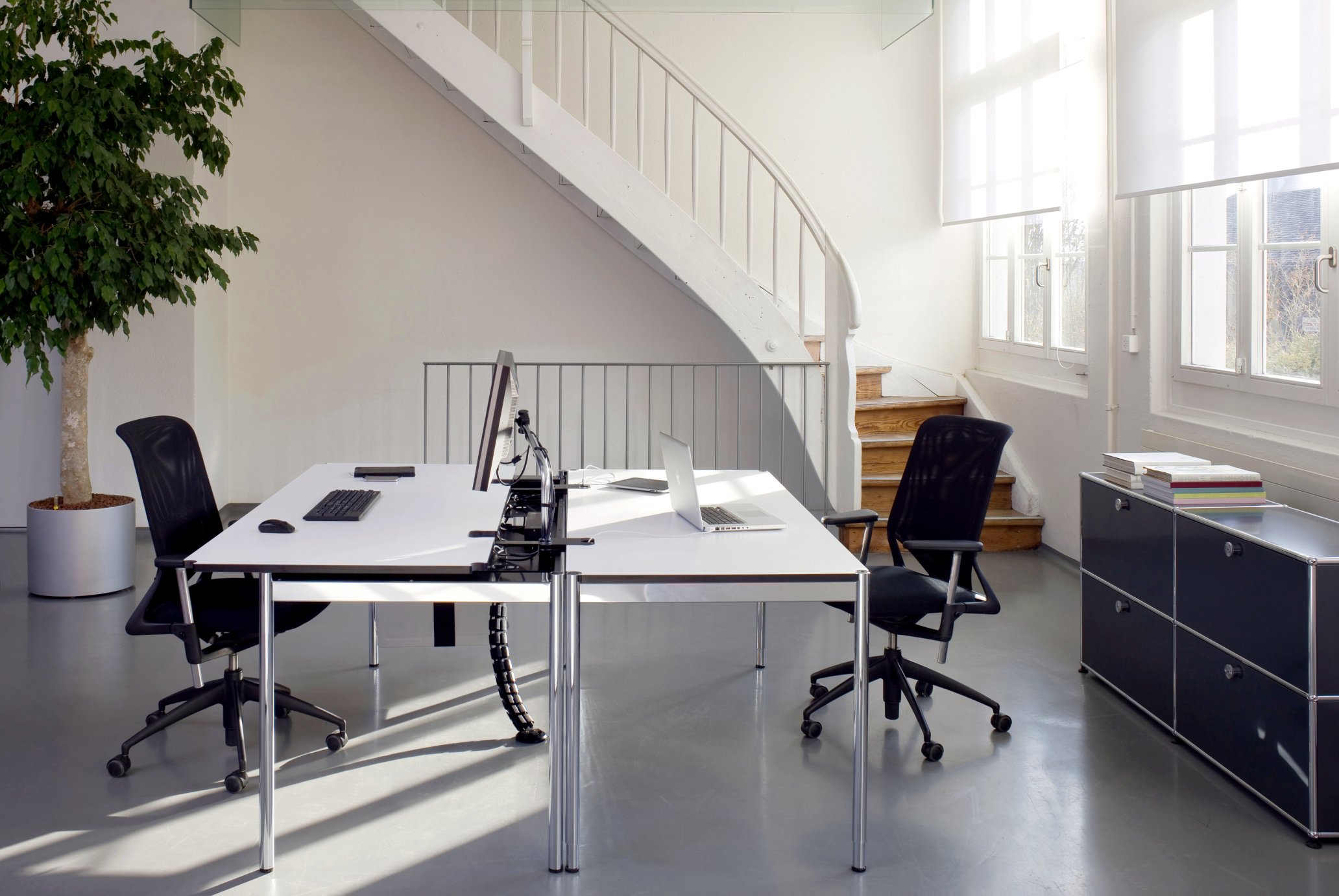 Thanks to their modularity USM Haller furniture is highly adaptable and flexible in any work space and can be easily adapted to individual needs. In addition to numerous USM Haller office furniture solutions for the office, USM Haller tables are very popular as desks and conference tables; USM Haller Plus desks are perfectly tailored to the requirements of work contexts with practical details such as cable passages and adaptation points for accessories.